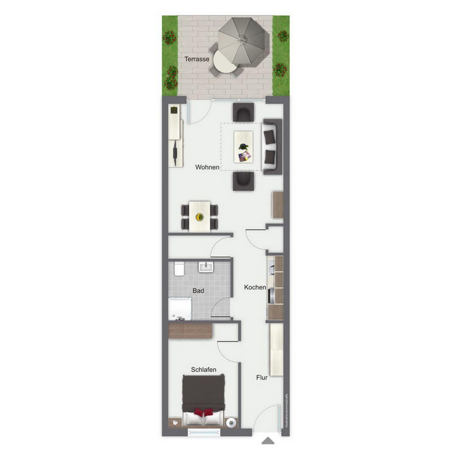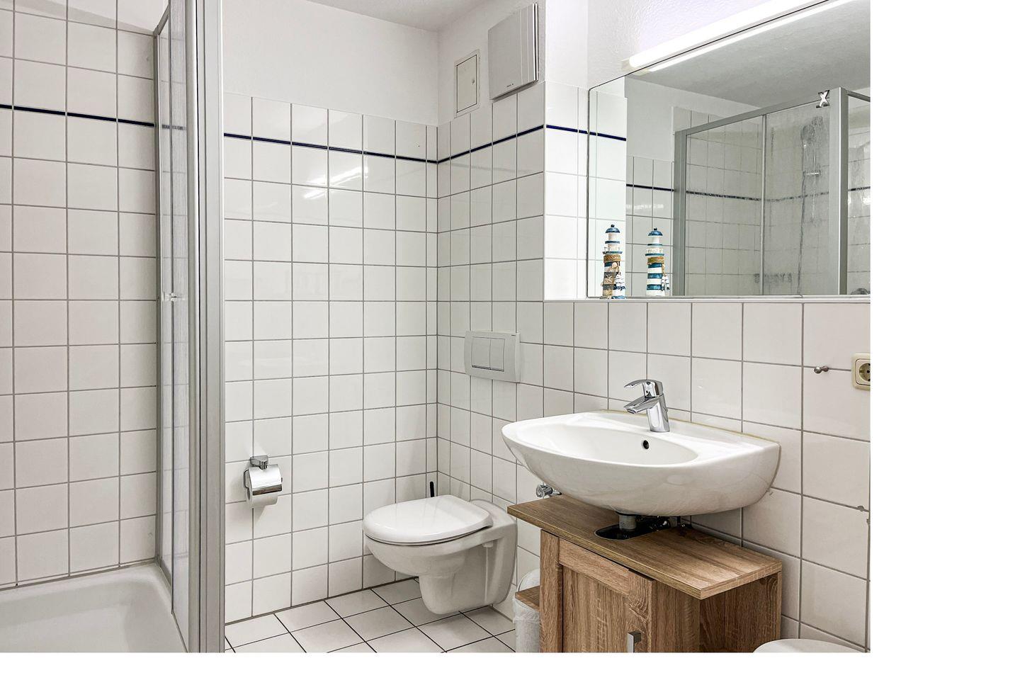 Ein funktionelles und gefliestes Duschbad gehört ebenfalls zur Wohnung. Fahrräder können im Fahrradkeller im Haus abgestellt werden. In dieser Nichtraucherwohnung sind maximal zwei Haustiere erlaubt.