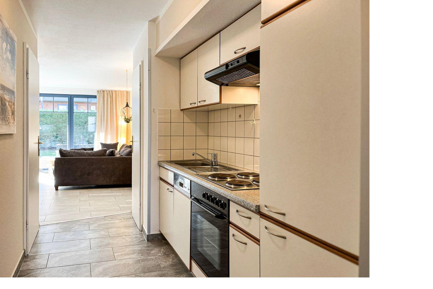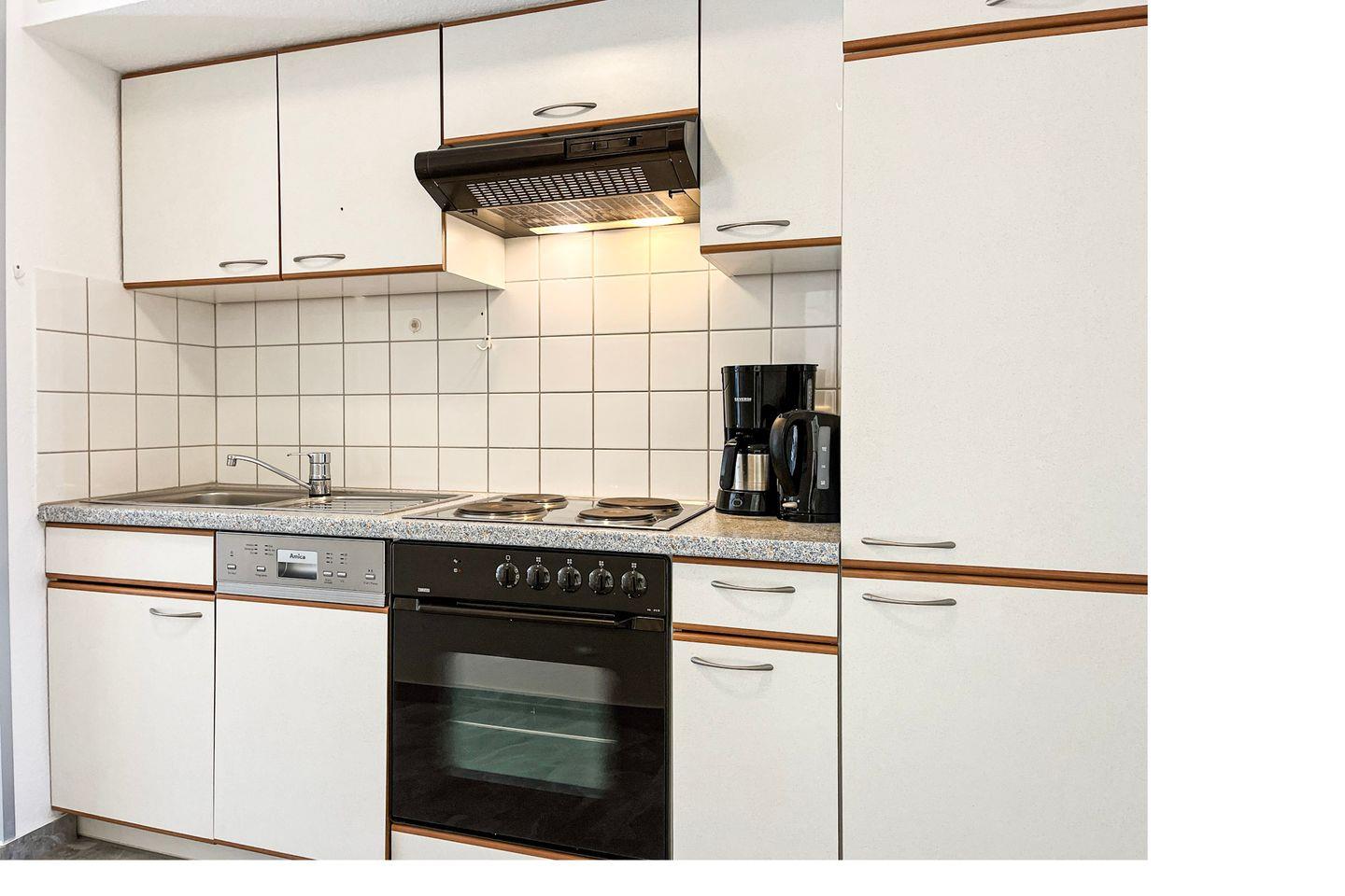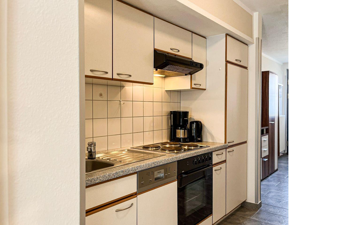 In unmittelbarer Nähe der Essecke befindet sich die Küchenzeile mit Geschirrspüler, Kühlschrank mit Gefrierfach, 4-Platten-Herd mit Backofen und einer Mikrowelle. Der Bodenbelag in der gesamten Ferienwohnung ist Laminat.