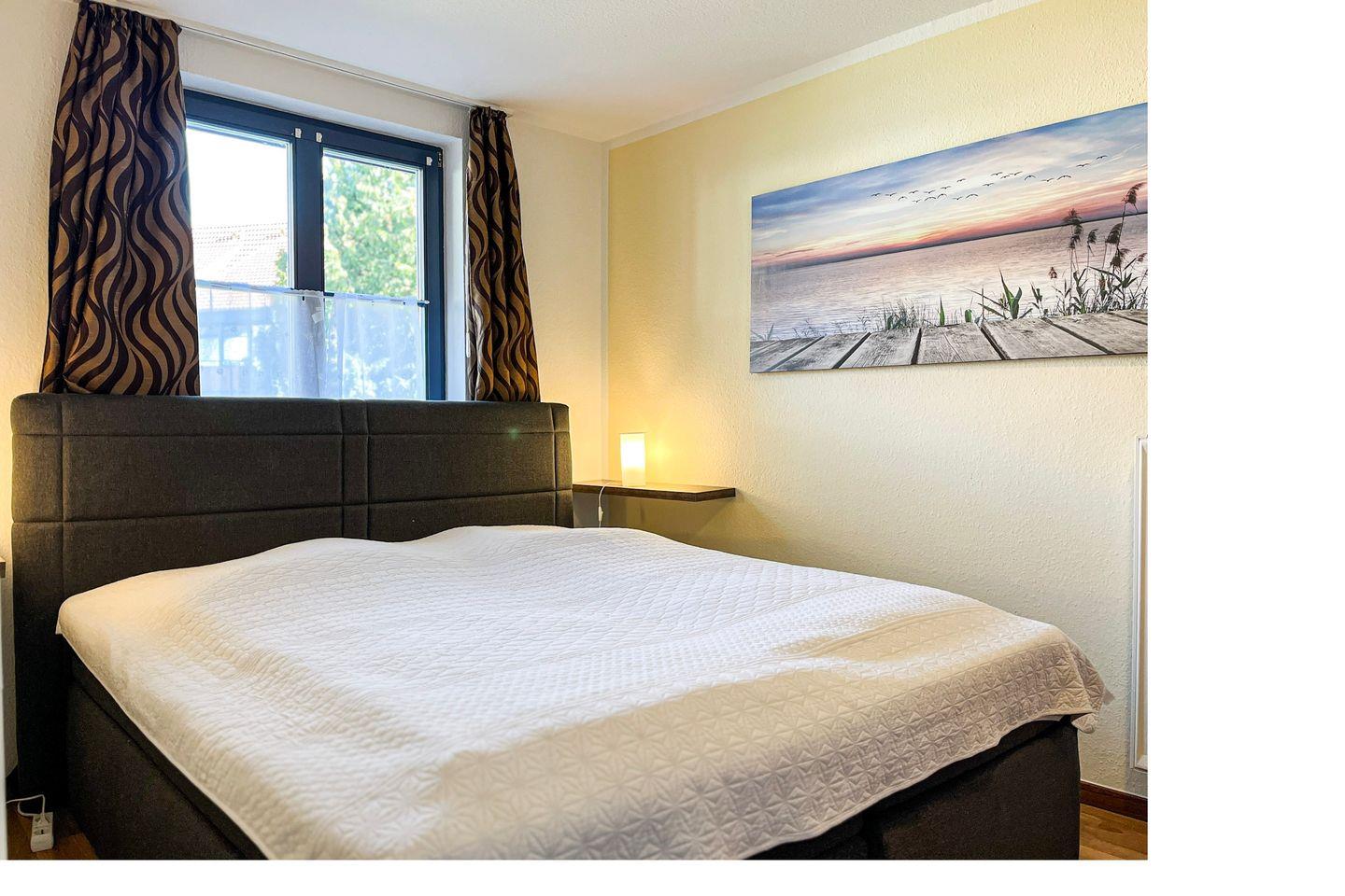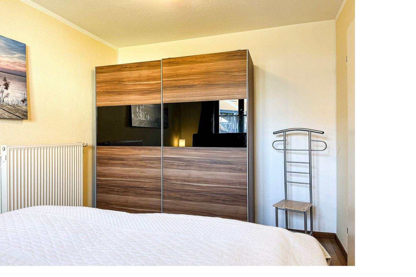 Das Schlafzimmer ist mit einem Doppelbett (180 x 200 cm) und einem Kleiderschrank für die Urlaubsgarderobe möbliert. Ein zweiter großer Kleiderschrank auf dem Flur bietet weiteren Stauraum. Zur Verdunkelung gibt es Vorhänge an den Fenstern.