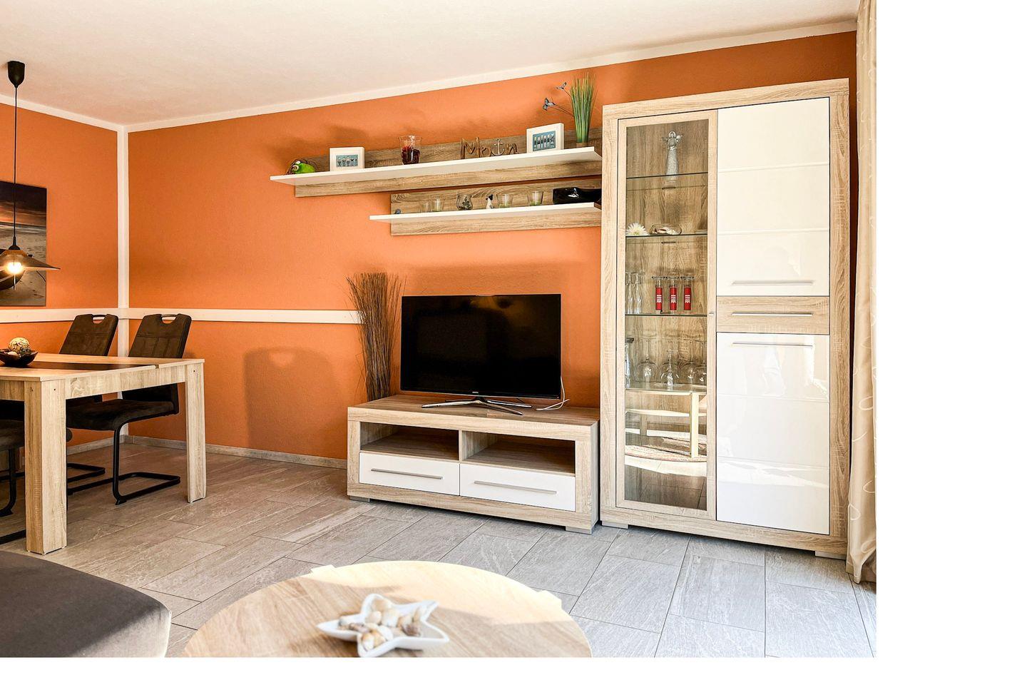 Die begrünte und sonnige Terrasse mit Mobiliar erreichst du vom Wohnraum. Der Wohn- und Essbereich ist modern und offen gestaltet und verfügt über einen großen Esstisch für gemeinsames Speisen. Die gemütliche Couch mit Schlaffunktion (145 x 200 cm) lädt zum Ausspannen ein. Ein Flachbild-TV und eine Stereoanlage sorgen für Unterhaltung.