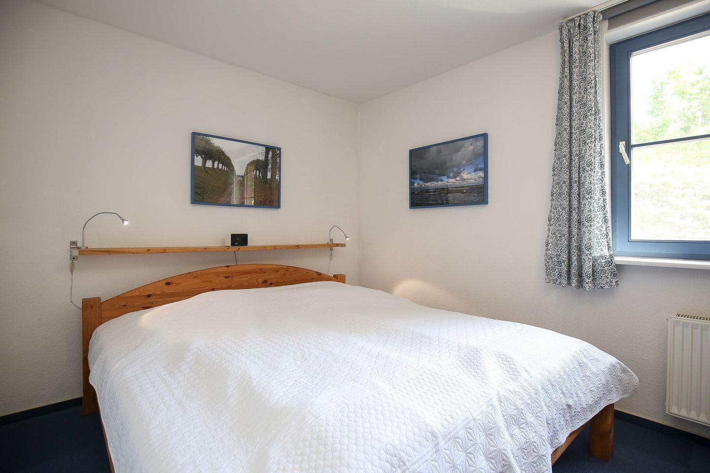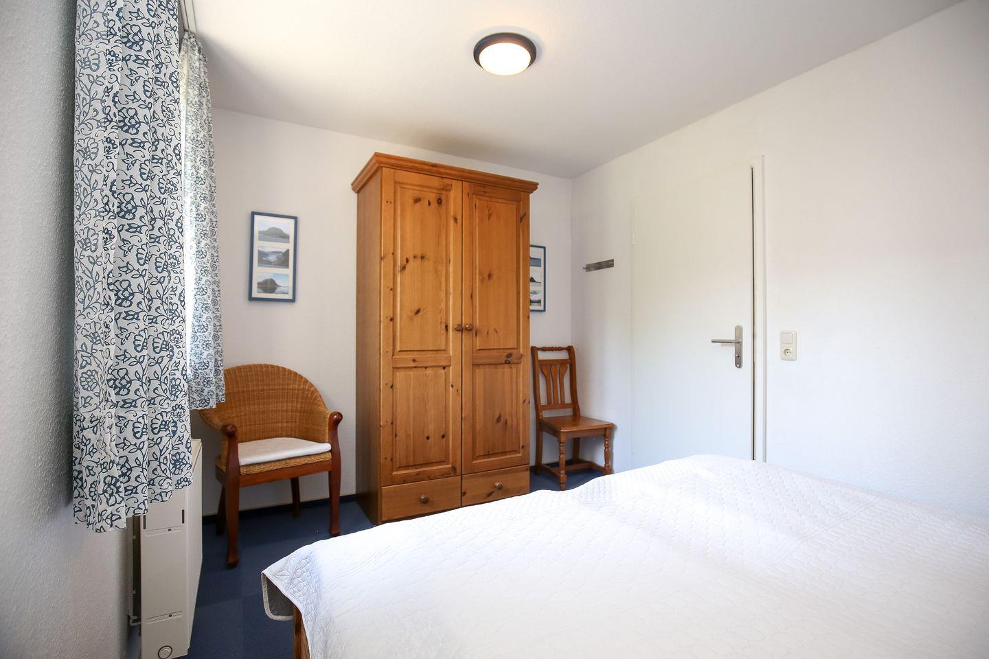 Das Schlafzimmer ist mit einem bequemen Doppelbett (2 x 90 x 200 cm) und einem Kleiderschrank eingerichtet. An den Fenstern befinden sich als Sichtschutz Vorhänge. Zusätzlich kannst du im großen Kleiderschrank im Eingangsbereich weitere Utensilien verstauen.