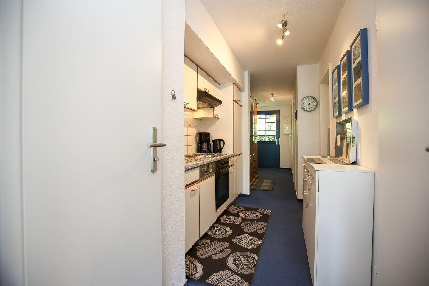 In der integrierten Küchenzeile sind ein 4-Plattenkochfeld, Backofen, Geschirrspüler, Kühlschrank mit Gefrierfach, Espressomaschine und Mikrowelle vorhanden. Hinweis für Allergiker: als Bodenbelag wurde in der gesamten Wohnung Teppich gewählt.