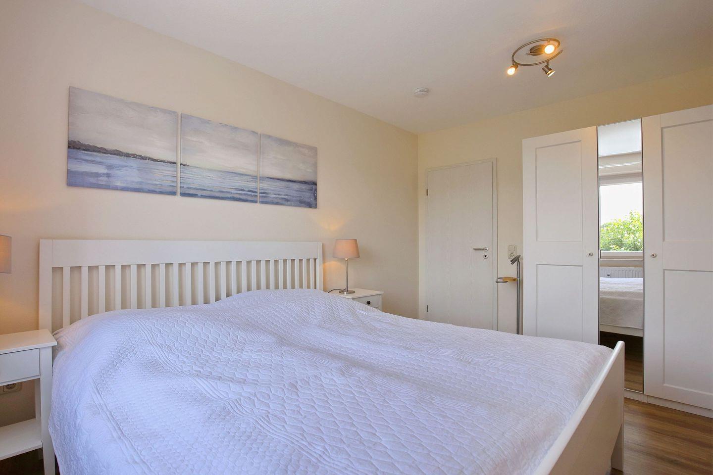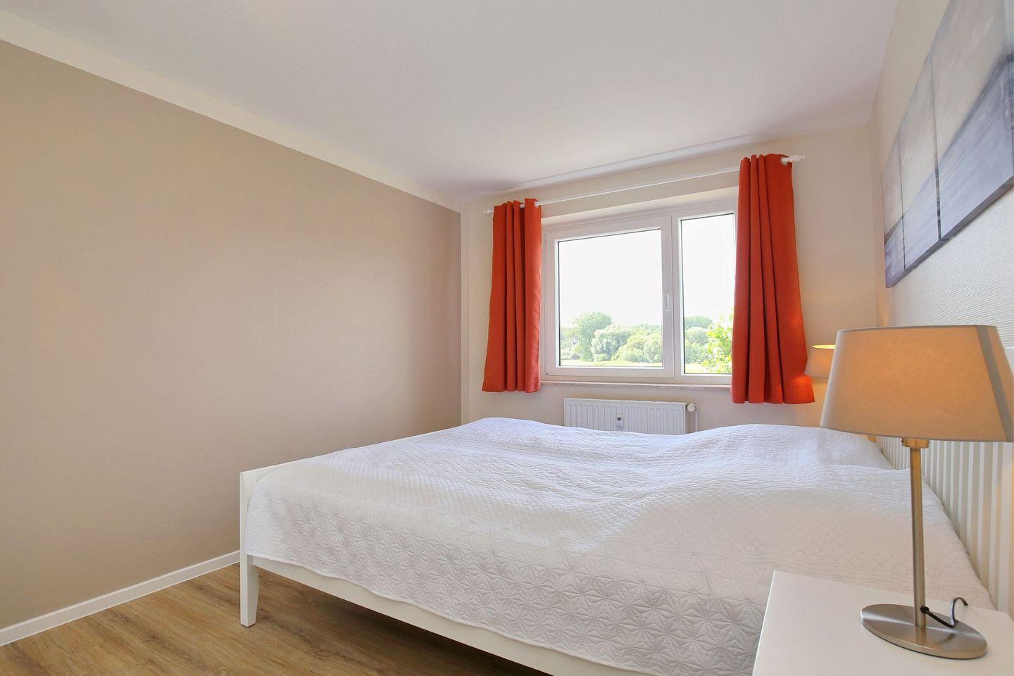 Im Schlafzimmer steht ein großes Doppelbett (2 x 90 x 200 cm) und ein Kleiderschrank mit viel Stauraum. Sehr gut abdunkelnde Vorhänge im Schlaf- und im Wohnzimmer ermöglichen dir einen erholsamen Schlaf und Privatsphäre.