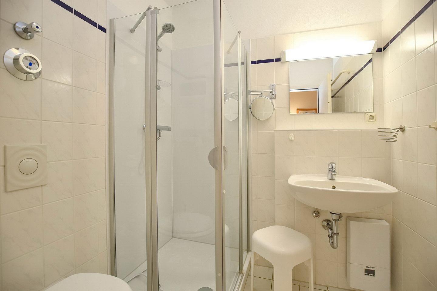 Das Badezimmer verfügt über eine neue Dusche aus Glas mit komfortablem Eckeinstieg. Ebenfalls vorhanden sind ein gut ausgeleuchteter Spiegel sowie Kosmetikspiegel, Föhn und genügend Ablagefläche.