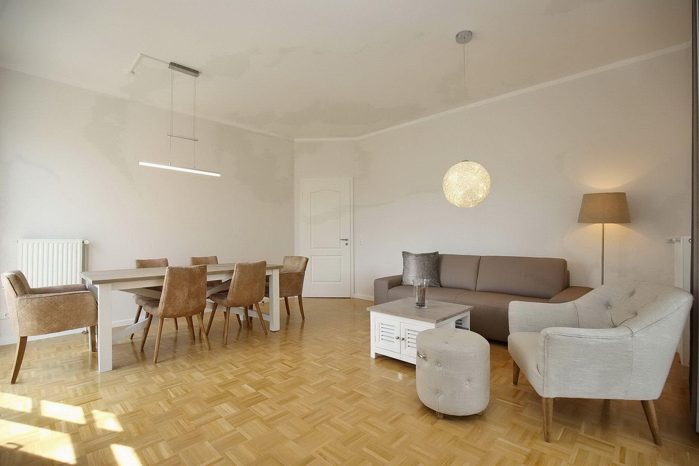 Die separate, geflieste Küche ist mit einem Geschirrspüler, Mikrowelle, Kühlschrank mit Gefrierfach und einem 4-Platten-Cerankochfeld ausgestattet. Ein großzügiges, gefliestes Duschbad ist ebenfalls vorhanden. Die Böden im Wohnzimmer und den Schlafzimmern sind mit Parkett ausgelegt.
