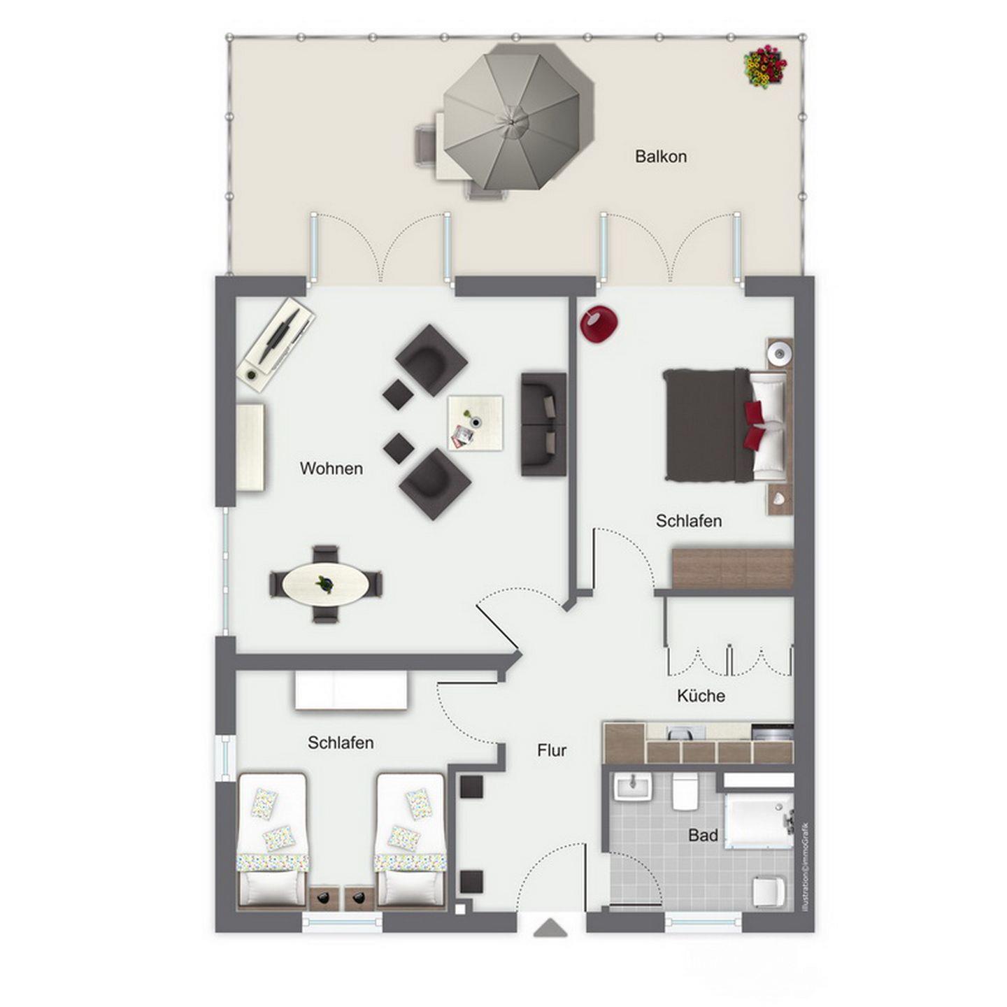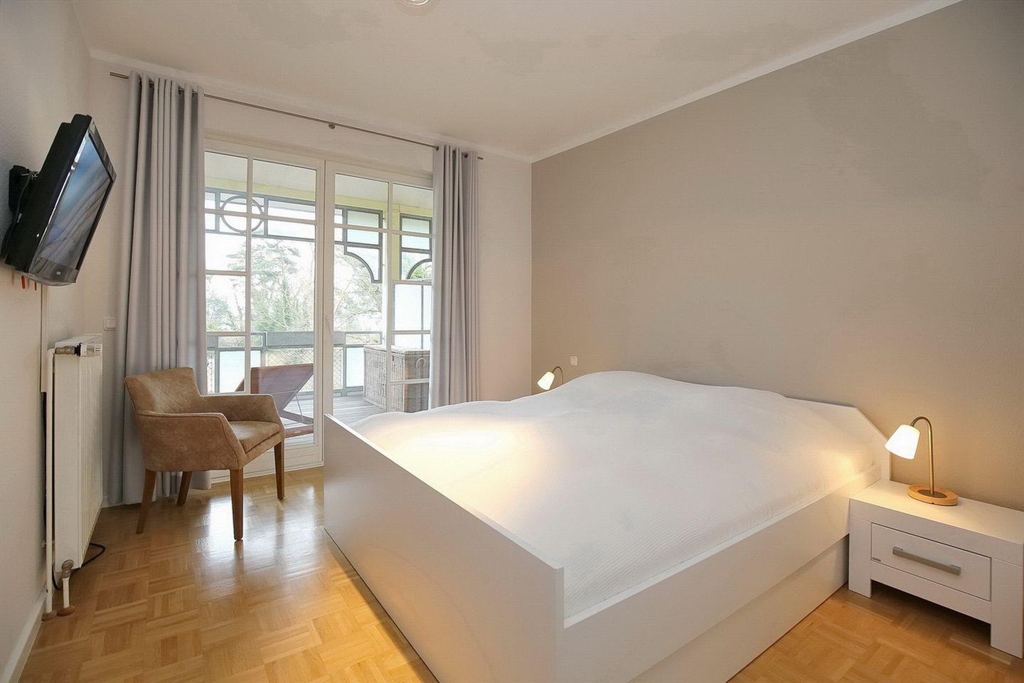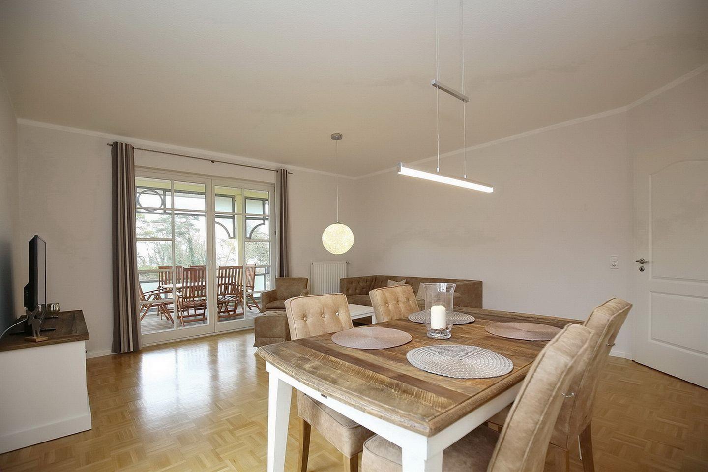 Der gemütliche Wohnbereich lädt zum Verweilen ein. Ein Flachbild-Fernseher sowie eine Stereoanlage stehen zu deiner Unterhaltung bereit. Vom Wohnzimmer aus gelangst du auf den großzügigen, möblierten Balkon, von dem du im Winter sogar etwas Seeblick hast. Die gesamte Wohnung ist mit Parkett ausgelegt.