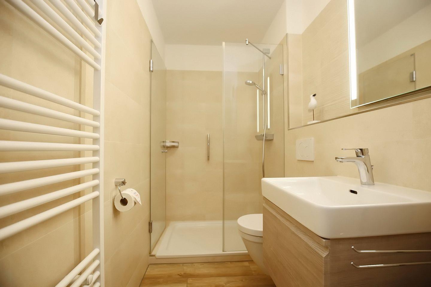 Das hell geflieste Duschbad bietet einen Waschtisch, eine Dusche und ein WC. In dieser Nichtraucherwohnung sind Haustiere nicht erlaubt. Ein Freistellplatz sorgt für die sichere Unterbringung deines Autos.