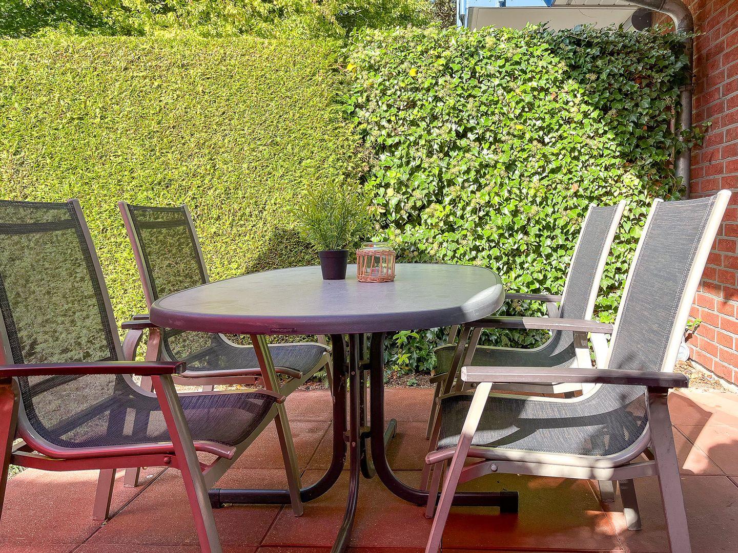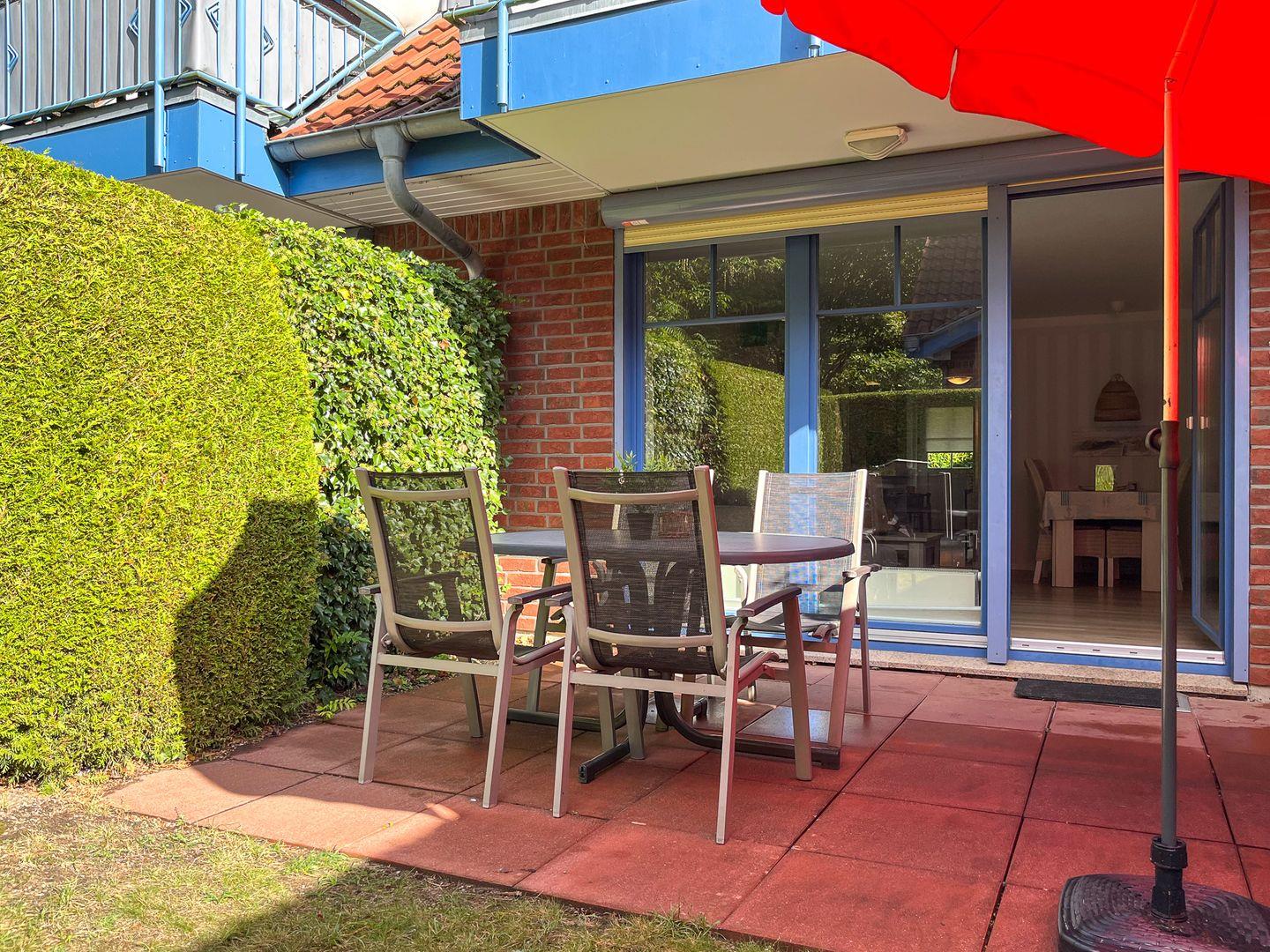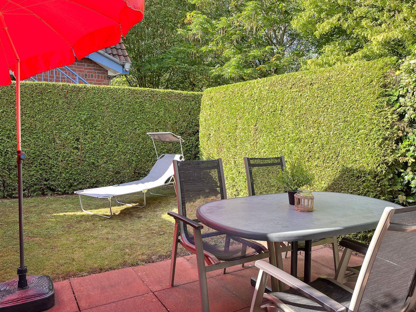 Die mit einer Hecke umgebene, teilüberdachte Terrasse lädt zum entspannten Aufenthalt im Freien ein. Terrassenmöbel mit Sonnenschirm und zwei Sonnenliegen stehen dir hier zur Verfügung.