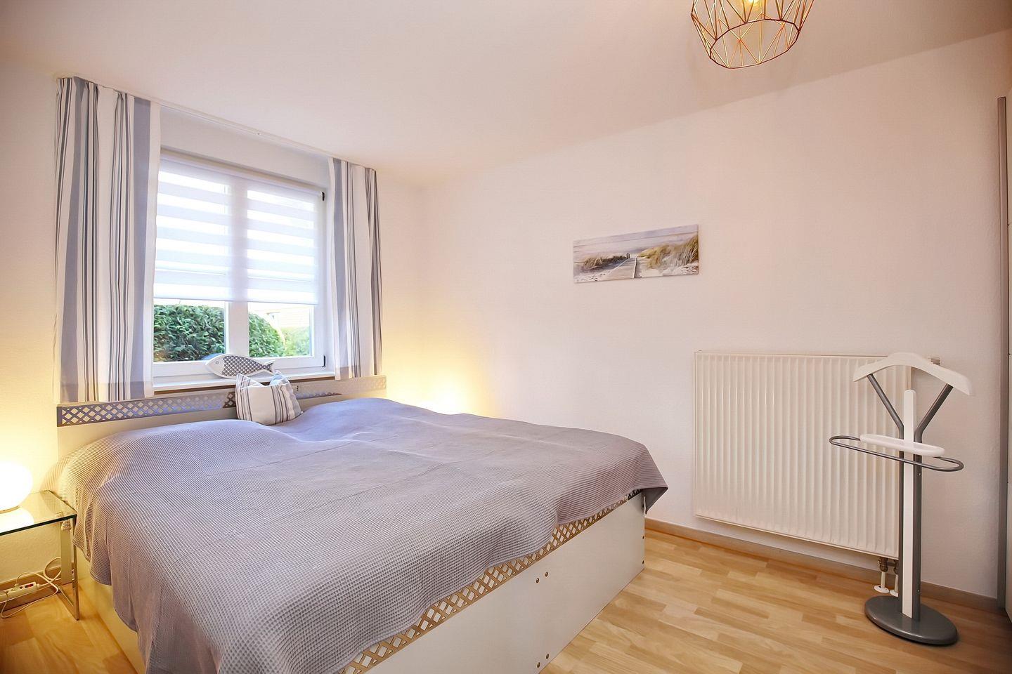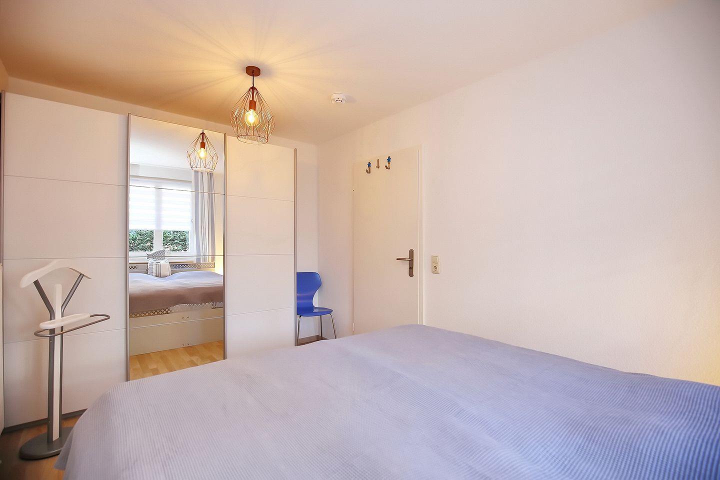 Das separate Schlafzimmer ist mit einem großzügigen Doppelbett (180 x 200 cm) und einem geräumigen Kleiderschrank für die gesamte Urlaubsgarderobe eingerichtet. An allen Fenstern der Wohnung sind Außenjalousien zur Abdunkelung angebracht.