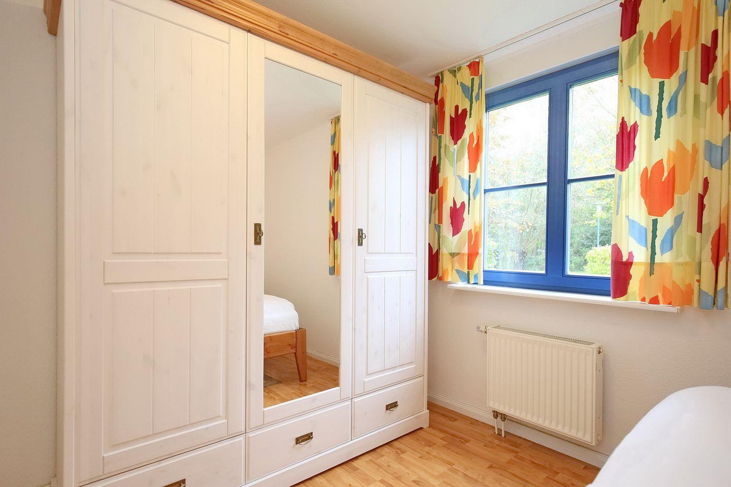 Das Schlafzimmer ist mit einem Doppelbett (180 x 200 cm) und einem großen Kleiderschrank für deine Garderobe eingerichtet. Außenjalousien an allen Fenstern dienen der Abdunkelung und sorgen für erholsamen Schlaf.