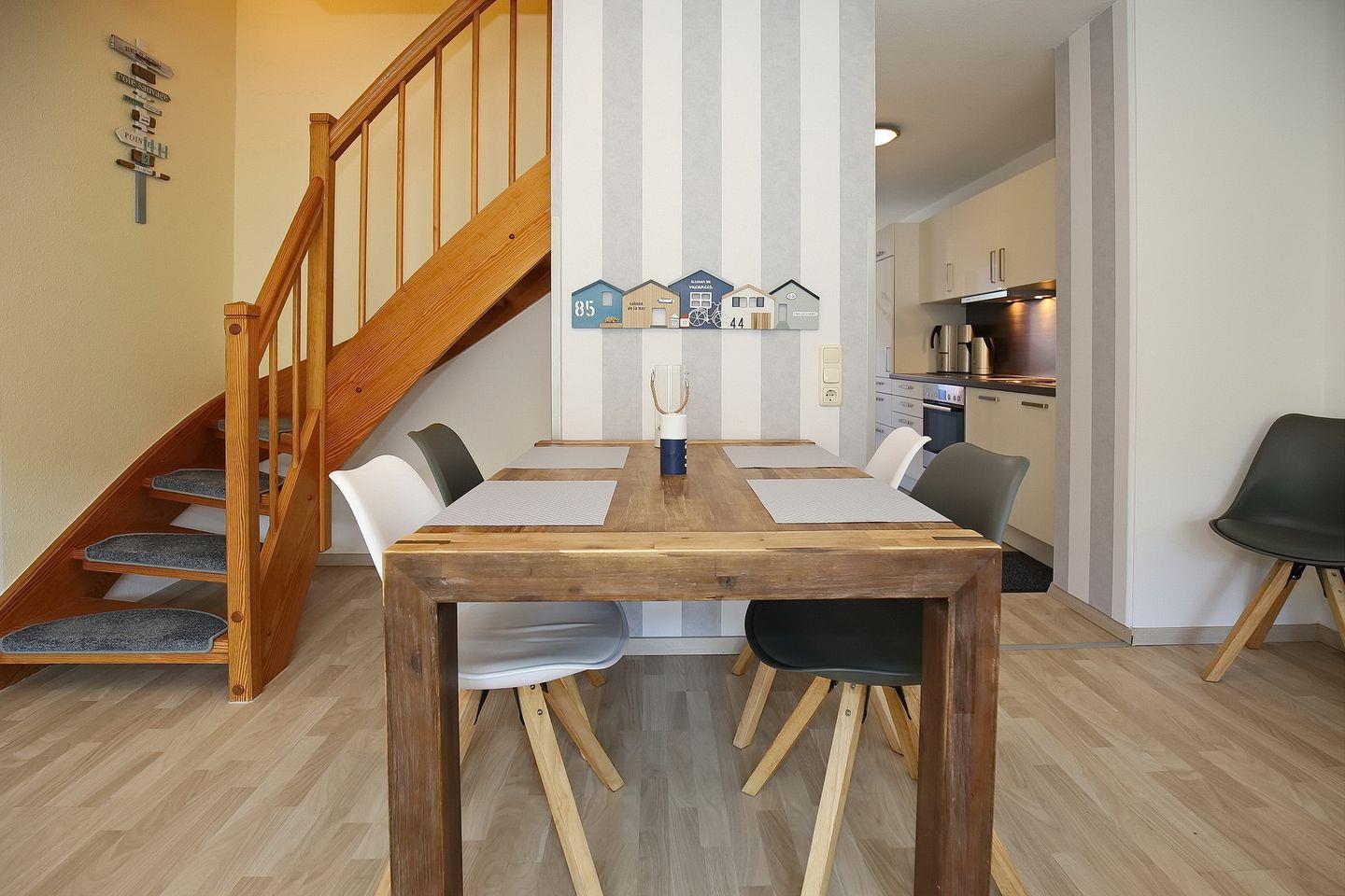 Deine liebevoll eingerichtete 4-Zimmer-Ferienwohnung mit einem Balkon in Süd-West Lage liegt im 1.OG und hat einen eigenen Zugang über die Außentreppe. Die Wohnung mit ca. 68 m² Wohnfläche verläuft über zwei Etagen und verfügt über einen Wohn- und Essbereich, eine integrierte Küchenzeile, drei Schlafzimmer und ein Duschbad. Die Entfernung zum Strand beträgt von der Ferienanlage Papillon etwa 250 m.