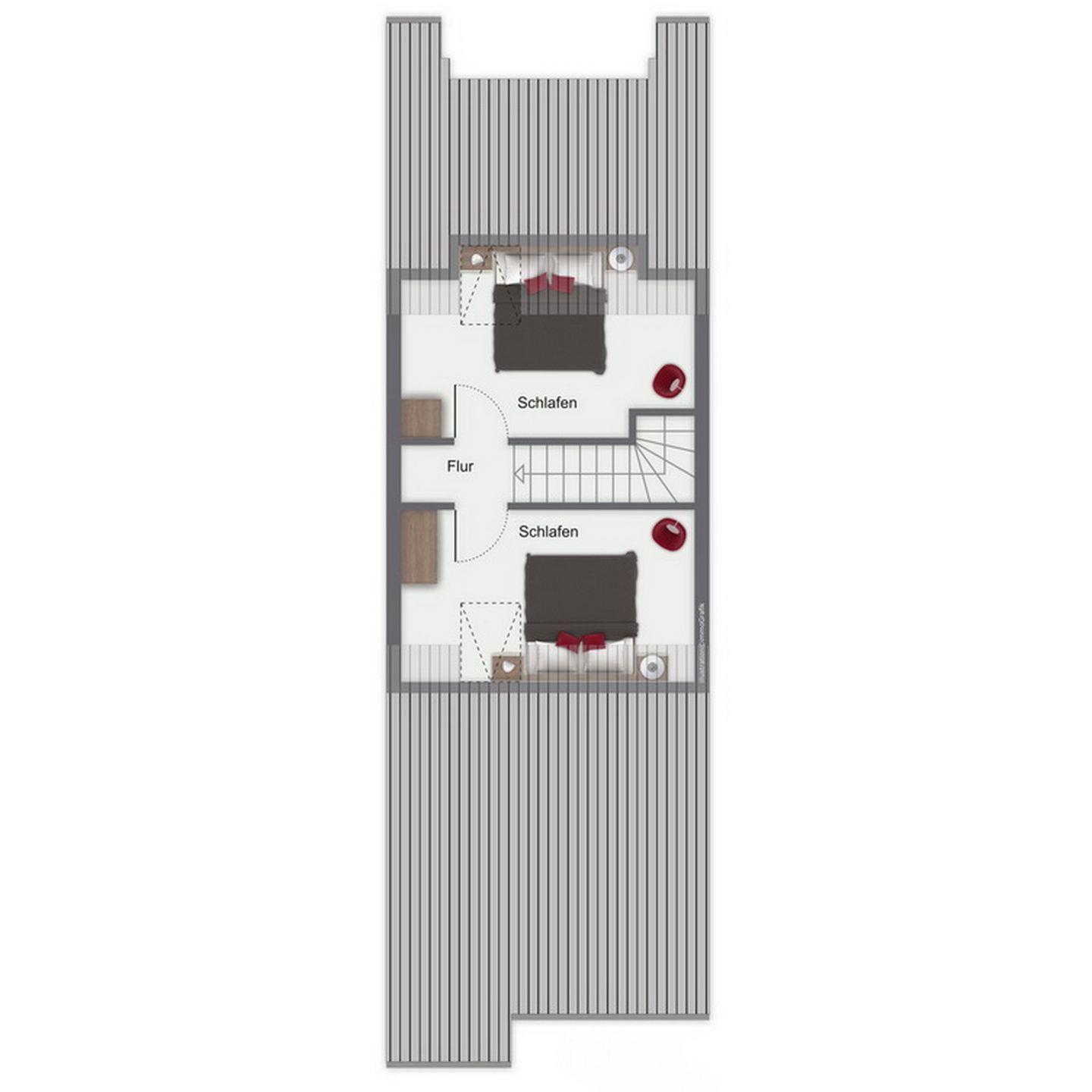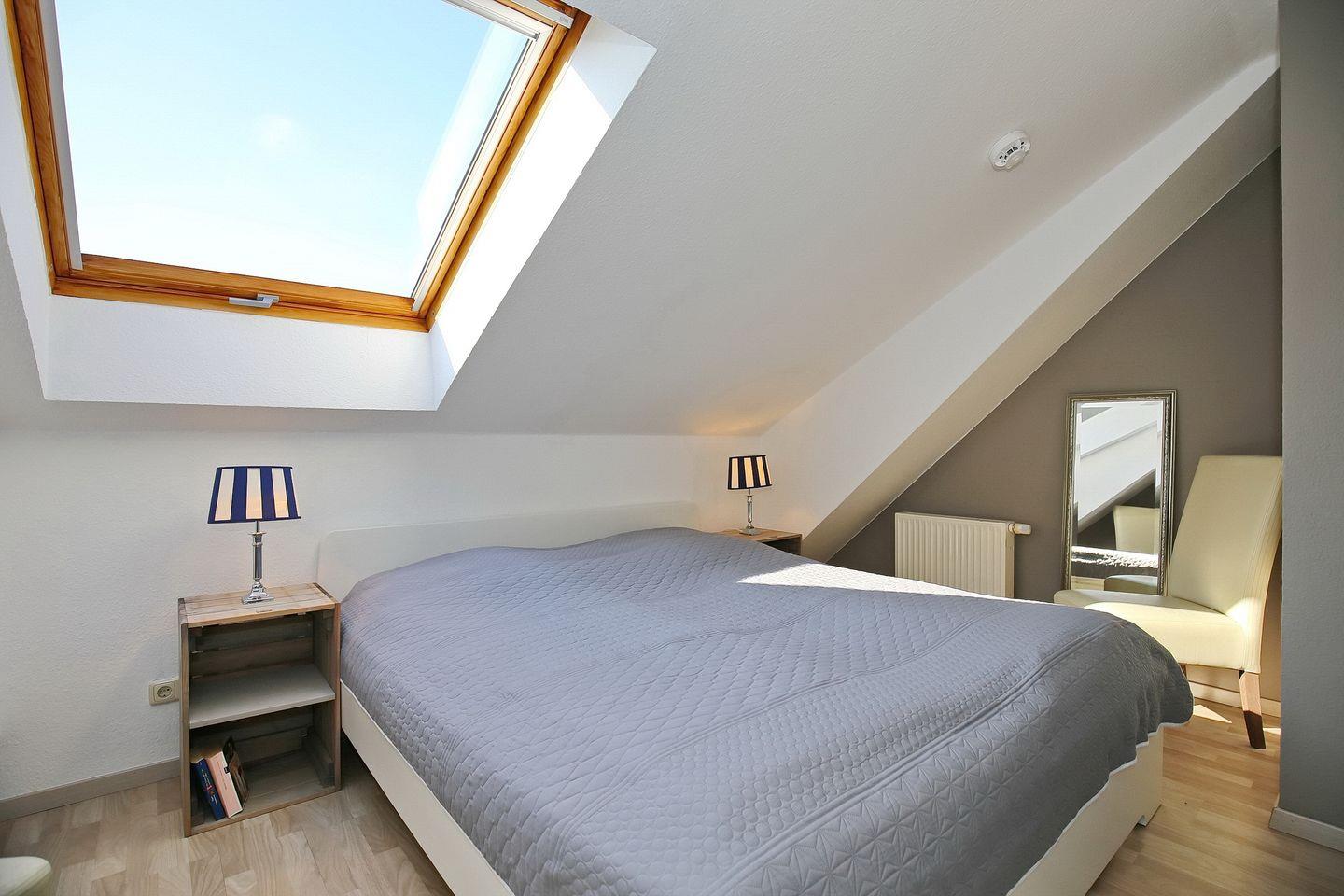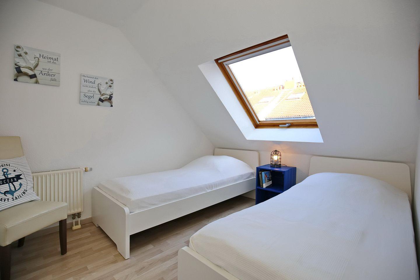 Im Schlafzimmer im 1. OG findest du neben zwei Einzelbetten (90 x 200 cm) auch einen Kleiderschrank vor. Beide Schlafzimmer im Dachgeschoss sind mit jeweils einem Doppelbett (2 x 90 x 200 cm und 2 x 80 x 200 cm) und einem Kleiderschrank eingerichtet. Zur Verdunkelung gibt es Rollos und teilweise Außenjalousien an den Fenstern.