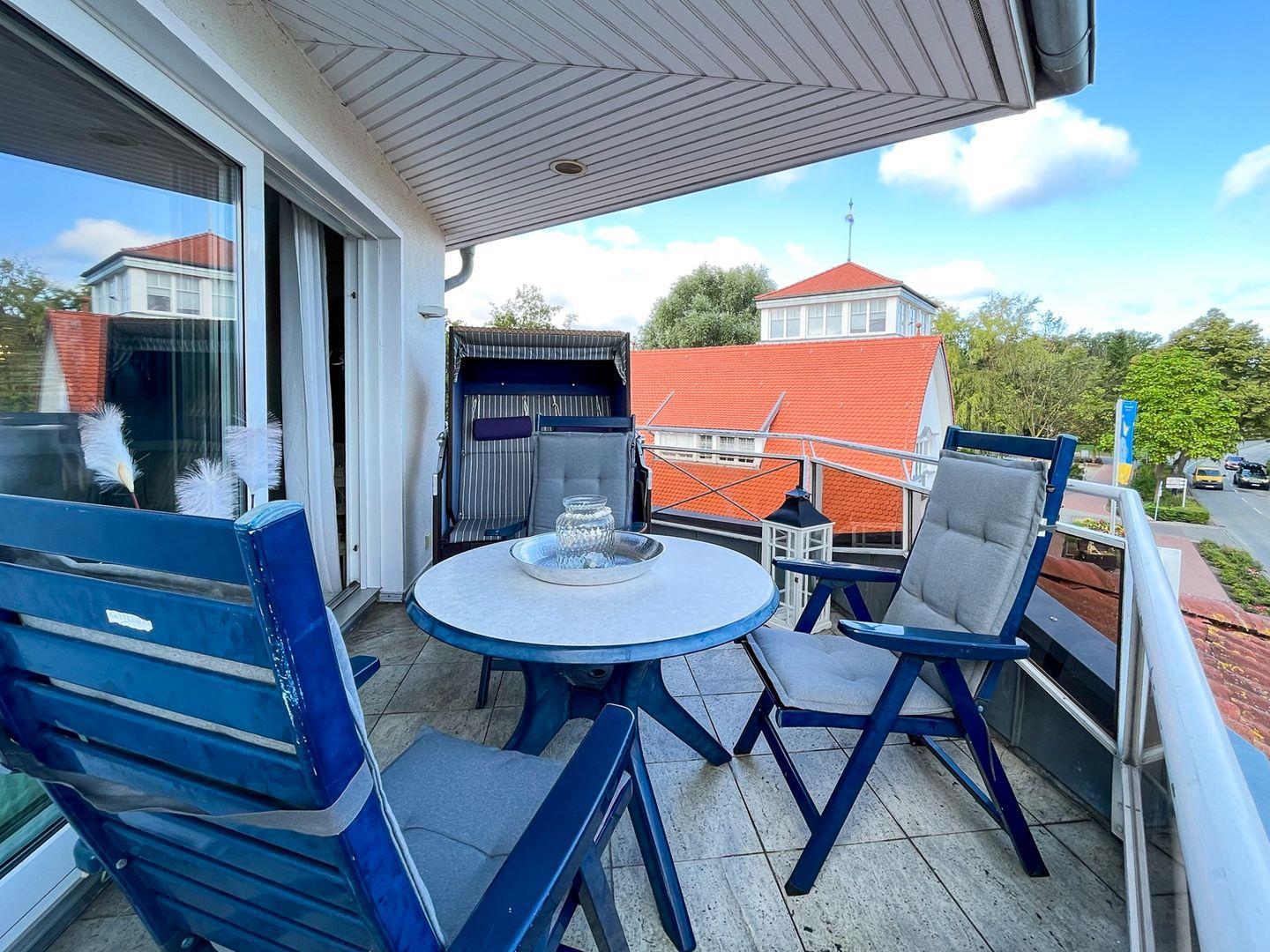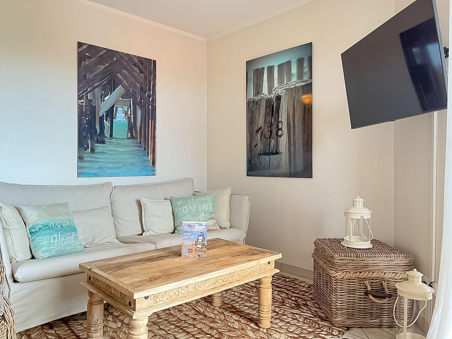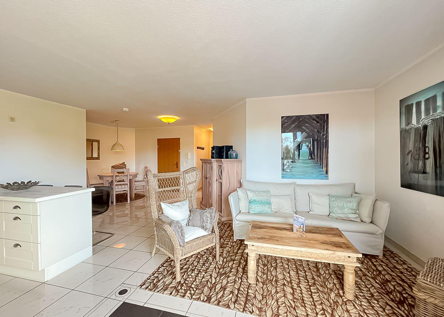 Die Ausstattung dieser Ferienwohnung lässt keine Wünsche offen. In der gemütlichen Sitzecke sorgt der große Flachbildfernseher für Kurzweil. Direkt vom Wohnzimmer gelangst du auf den Balkon mit Strandkorb, von dem du teilweise sogar Seeblick hast.