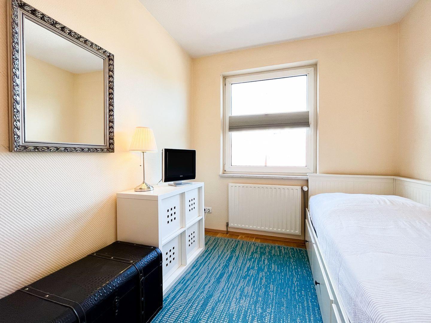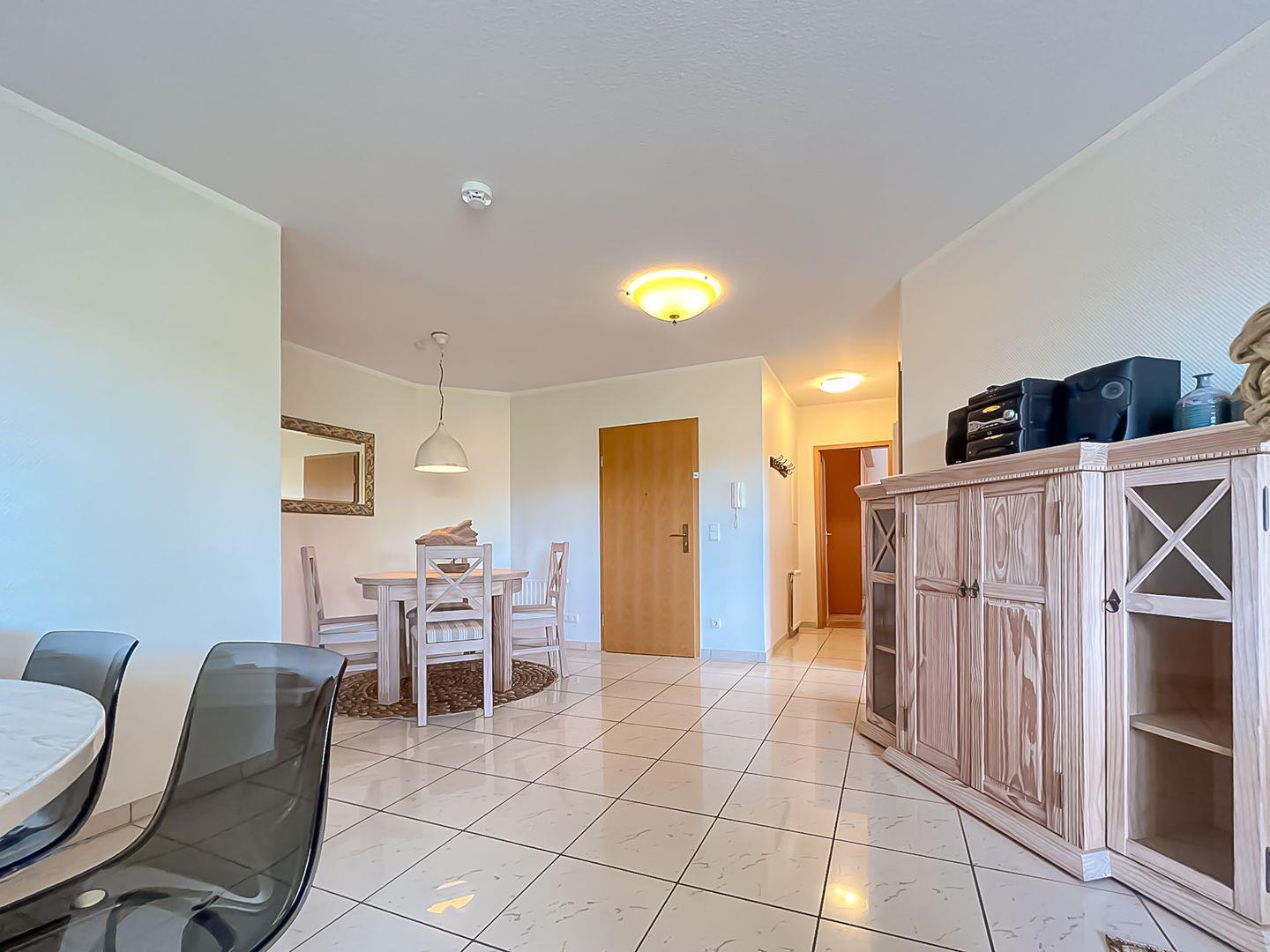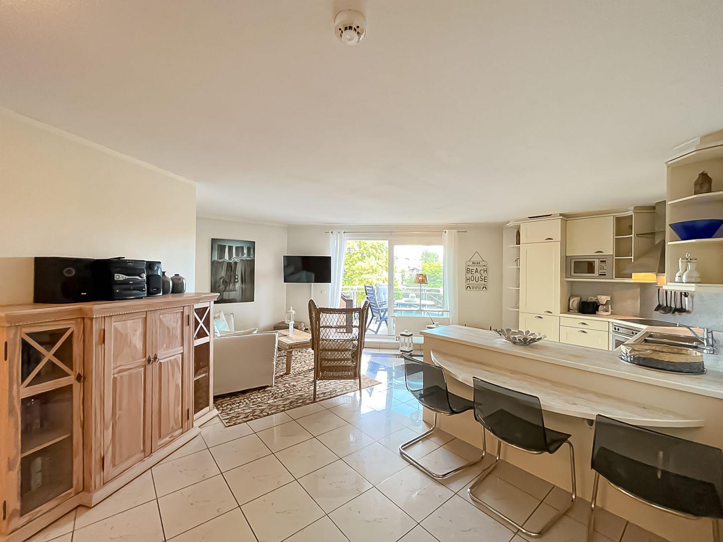 Die Ausstattung dieser Ferienwohnung lässt keine Wünsche offen. In der gemütlichen Sitzecke sorgt der große Flachbildfernseher für Kurzweil. Direkt vom Wohnzimmer gelangst du auf den Balkon mit Strandkorb, von dem du teilweise sogar Seeblick hast.