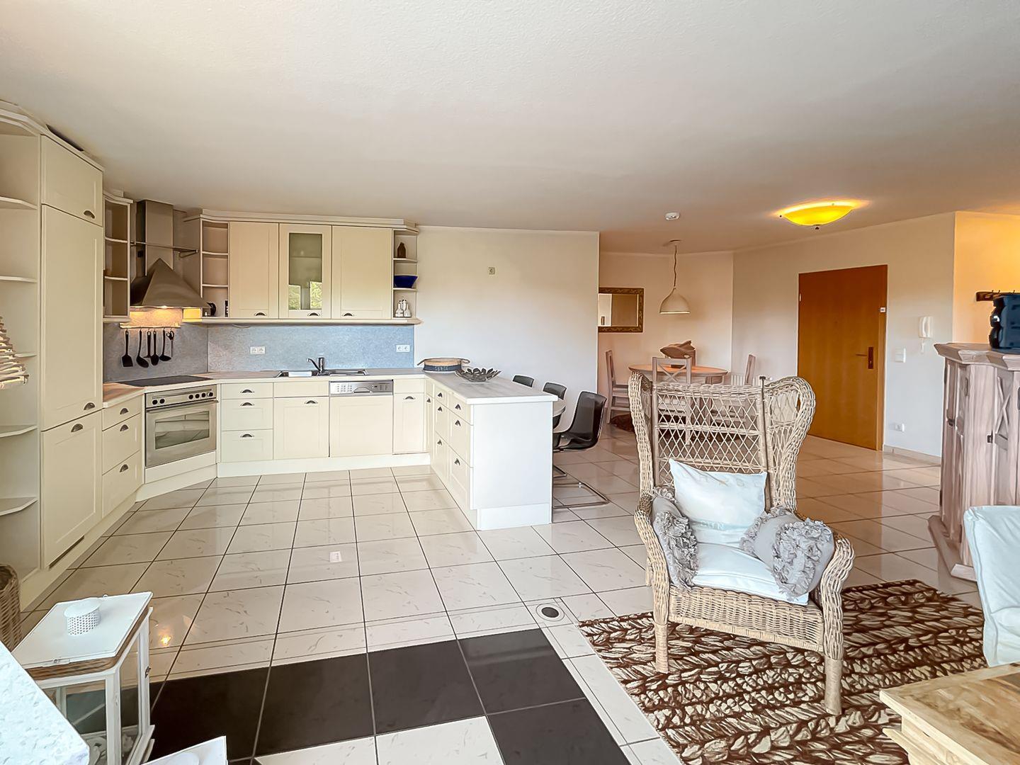 Die moderne Einbauküche der Ferienwohnung bietet allen Komfort. Unter anderem stehen dir ein Geschirrspüler, ein Kühlschrank mit Gefrierfach, eine Mikrowelle und ein Cerankochfeld zur Verfügung. An dem angrenzenden Essplatz kannst du dich kulinarischen Genüssen hingeben.