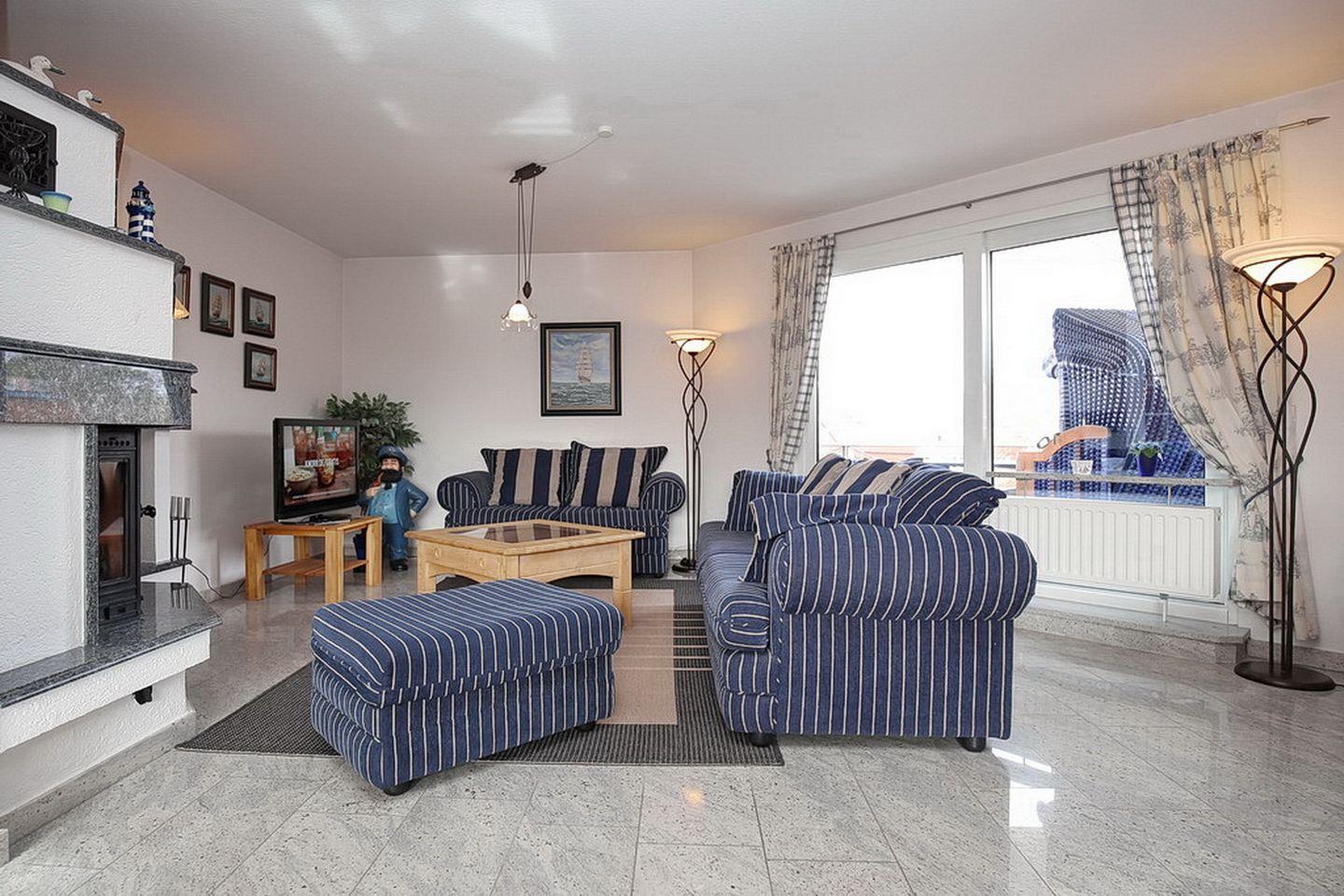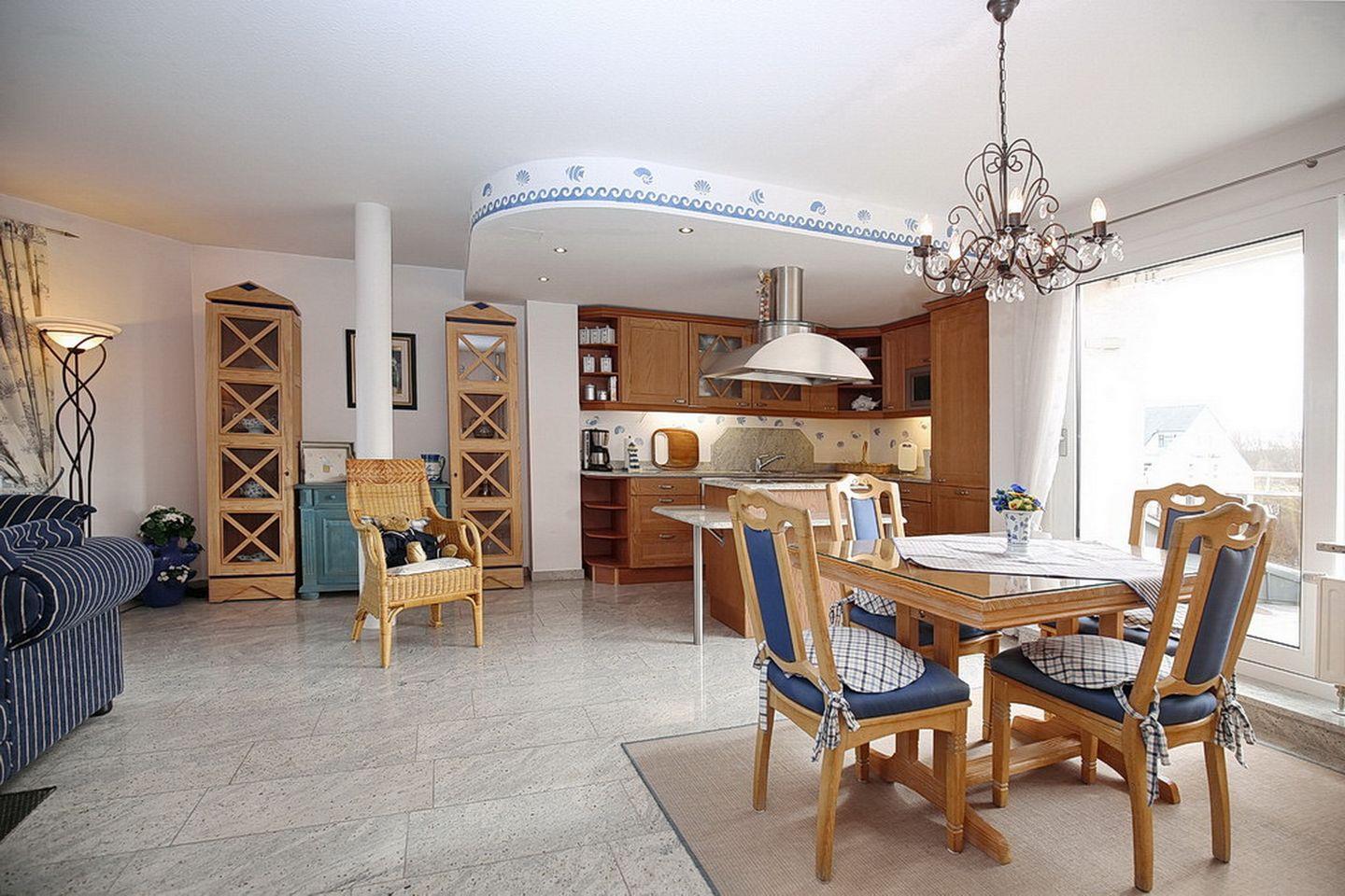 Hier erhältst du den Luxus, der deinen Urlaub zu etwas Besonderem macht. Im Ortszentrum gelegen, erwartet dich eine maritim eingerichtete Ferienwohnung. Das Wohnzimmer ist mit zwei Wohlfühlsofas ein echter Hingucker. Für gemütliche und entspannende Abende sorgt der eingebaute Kamin. Der angeschlossene Essbereich weist schöne Details auf. Selbstverständlich steht dir ein Flachbildfernseher zur Verfügung. Für Sonnenhungrige hat das Ferienappartement zwei Balkone. Der erste Balkon ist nach Nord-Ost ausgerichtet. Hier kannst du im Strandkorb über die Dächer von Boltenhagen blicken. Auf dem zweiten Balkon, der nach Süden ausgerichtet ist, kannst du die wärmenden Strahlen der Nachmittagssonne genießen.
