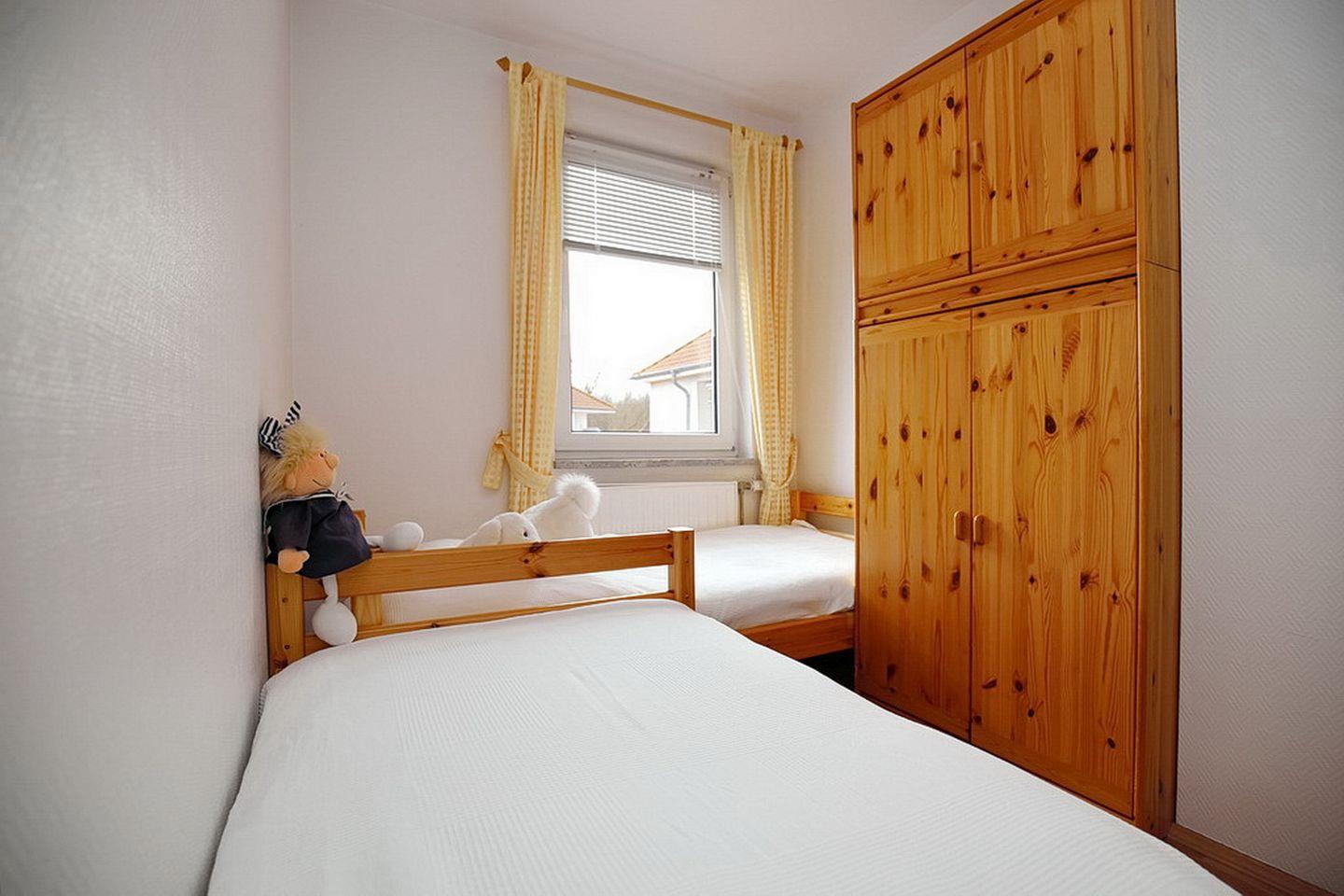Darüber hinaus hat die Ferienwohnung zwei mit Laminatfußboden ausgelegte Schlafzimmer. Das größere Schlafzimmer ist mit einem Doppelbett (2 x 90 x 200 cm) ausgestattet, im kleineren Schlafzimmer findest du zwei Einzelbetten (je 80 x 190 cm) vor. Mit Rollos können beide Schlafzimmer abgedunkelt werden.