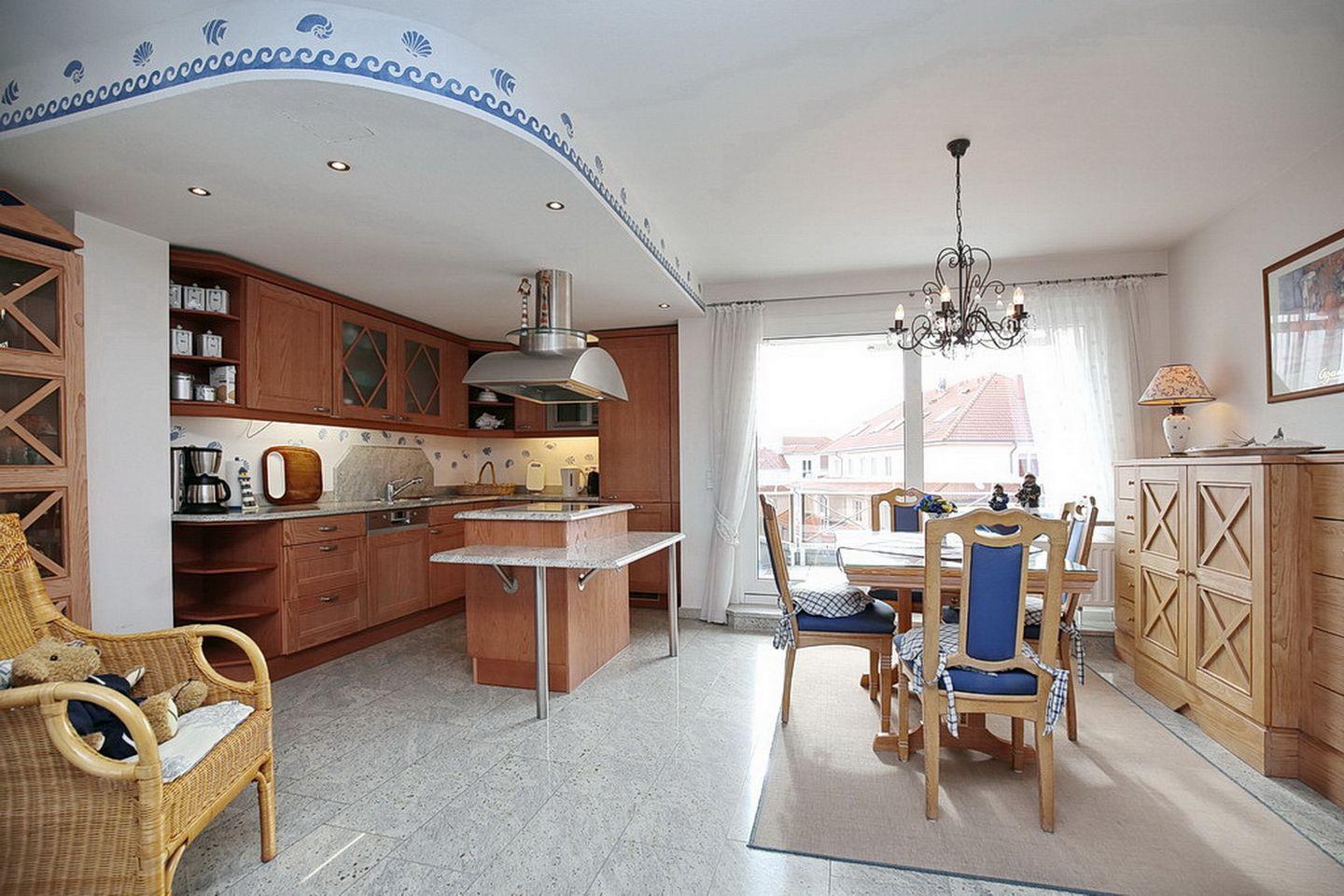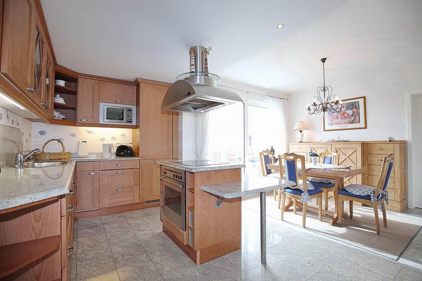 Die modern eingerichtete Küche der Ferienwohnung besticht durch ihre freistehende Kochinsel und die sehr gute Ausstattung mit Kühlschrank inklusive Gefrierfach, Cerankochfeld, Herd und Spülmaschine. Das exklusive, geflieste Badezimmer verfügt über Dusche und Badewanne. Ebenfalls steht dir hier eine Waschmaschine zur Verfügung.