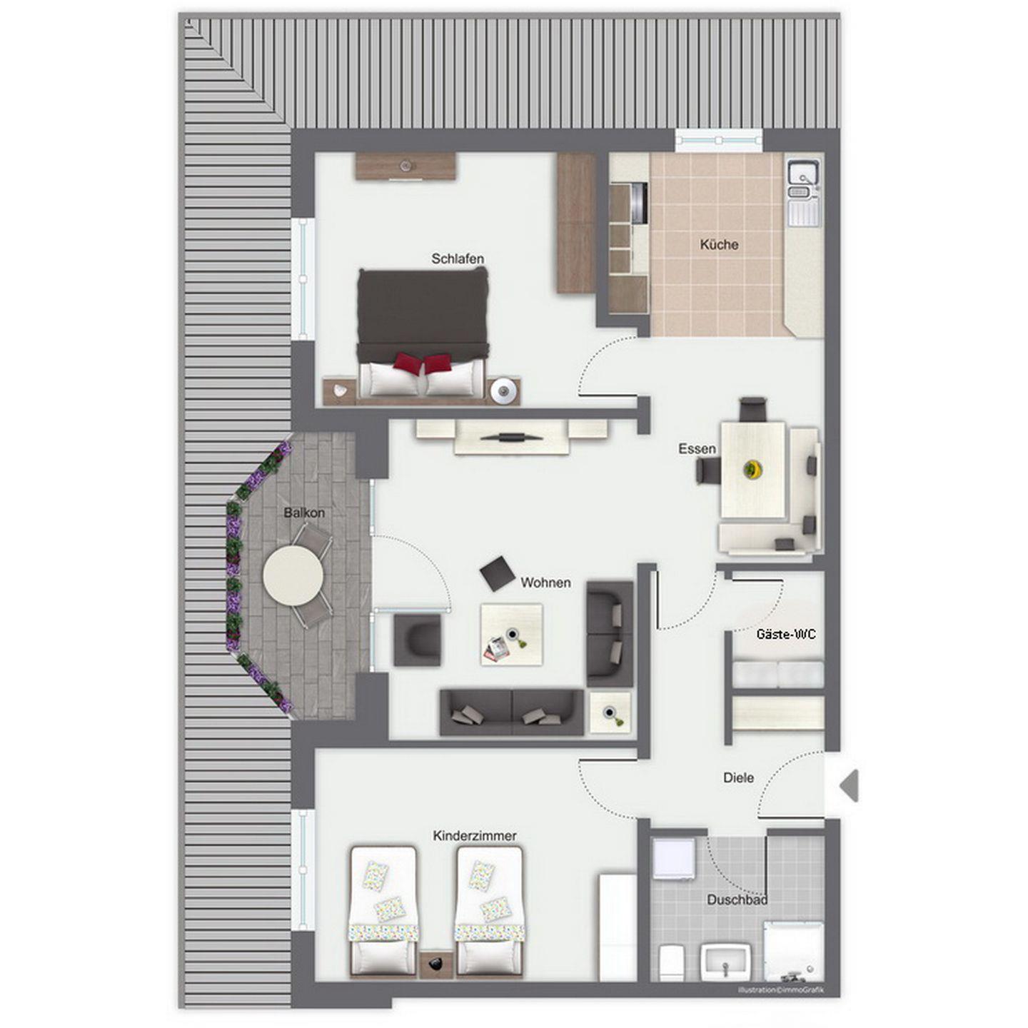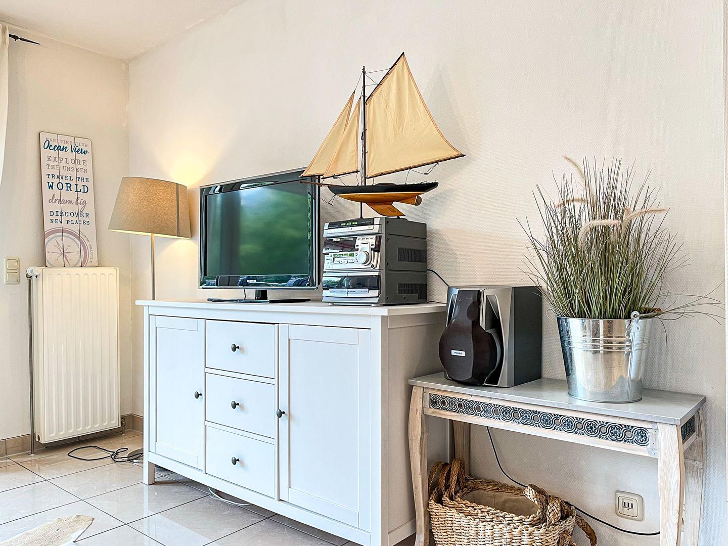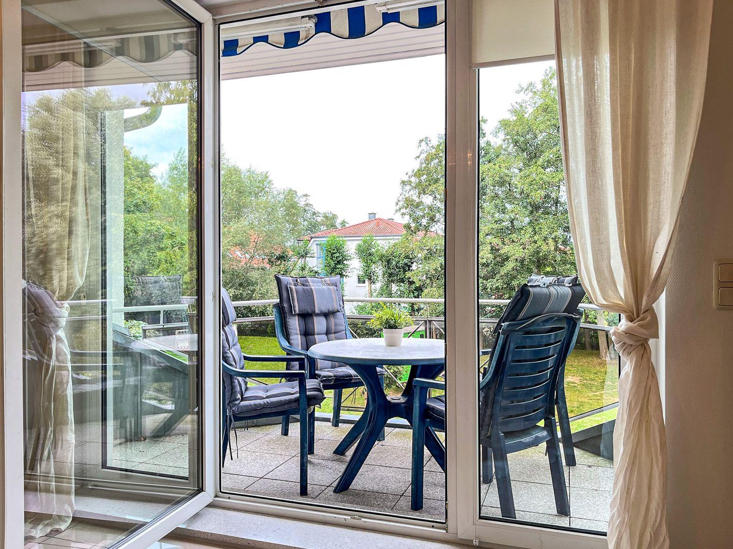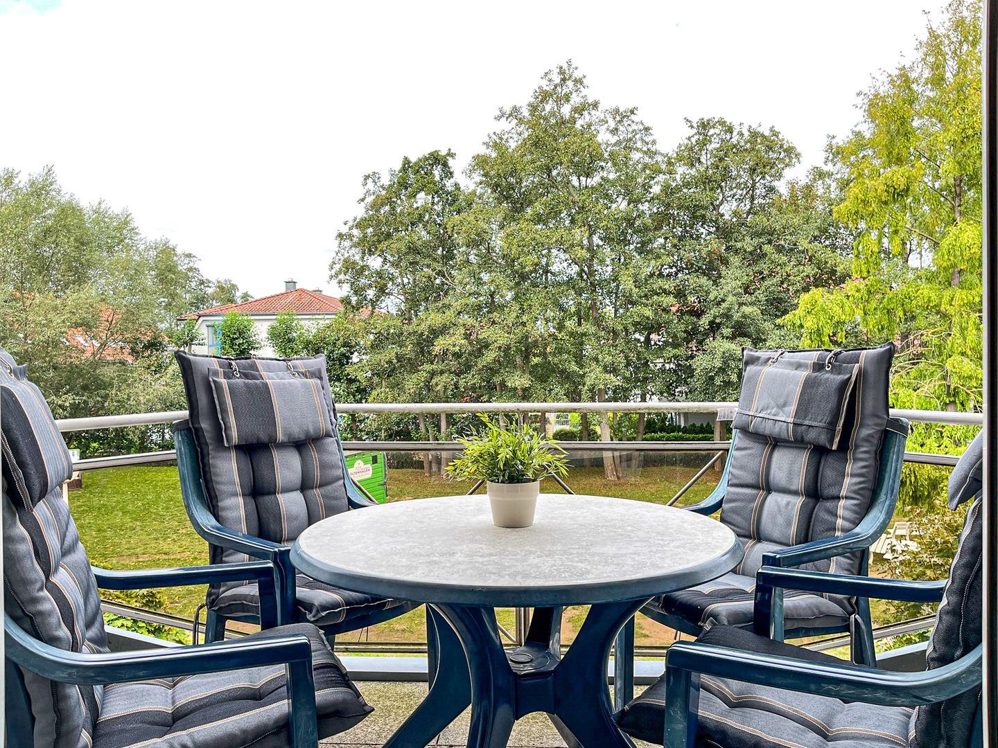 Im modern eingerichteten Wohnzimmer steht dir ein großer Flachbildfernseher für entspannte Fernsehabende zur Verfügung. Oder du relaxst einfach bei leiser Musik aus der Stereoanlage. Der Balkon in Richtung Westen ist mit Balkonmöbeln ausgestattet.