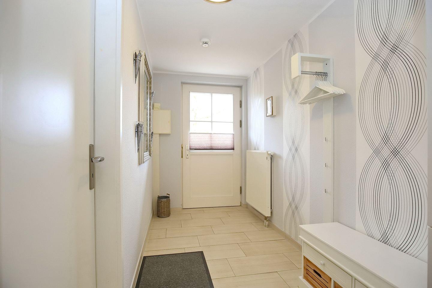 Die im Flur gelegene und im offenen Stil gehaltene Küchenzeile ist hochwertig ausgestattet und bietet neben Designgeschirr auch einen Geschirrspüler, ein Cerankochfeld, einen Backofen und einen Kühlschrank mit Gefrierfach.