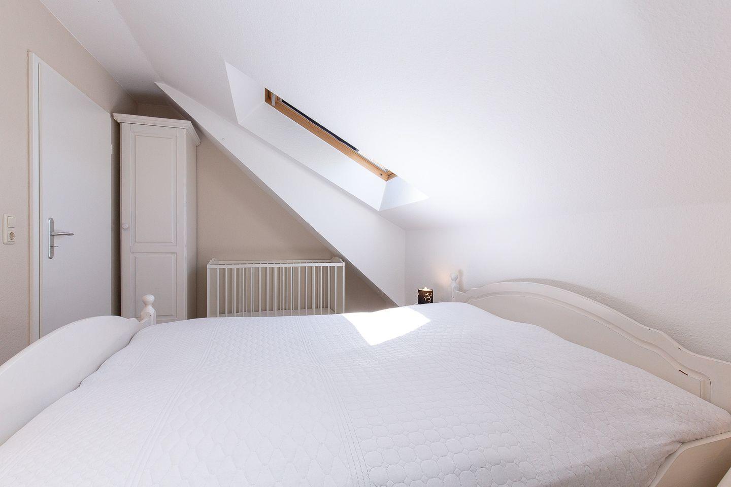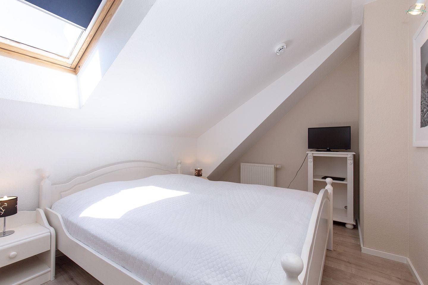 Im Schlafzimmer des 1. OG findest du neben zwei Einzelbetten (90 x 200 cm) auch einen Kleiderschrank vor. Die beiden Schlafzimmer im Dachgeschoss sind mit jeweils einem Doppelbett (2 x 90 x 200 cm und 2 x 80 x 200 cm) und einem Kleiderschrank möbliert. Ein weiteres Highlight hier ist der 2. TV in einem der oberen Schlafzimmer. Zur Verdunkelung an den Fenstern gibt es Rollos bzw. Außenjalousien.