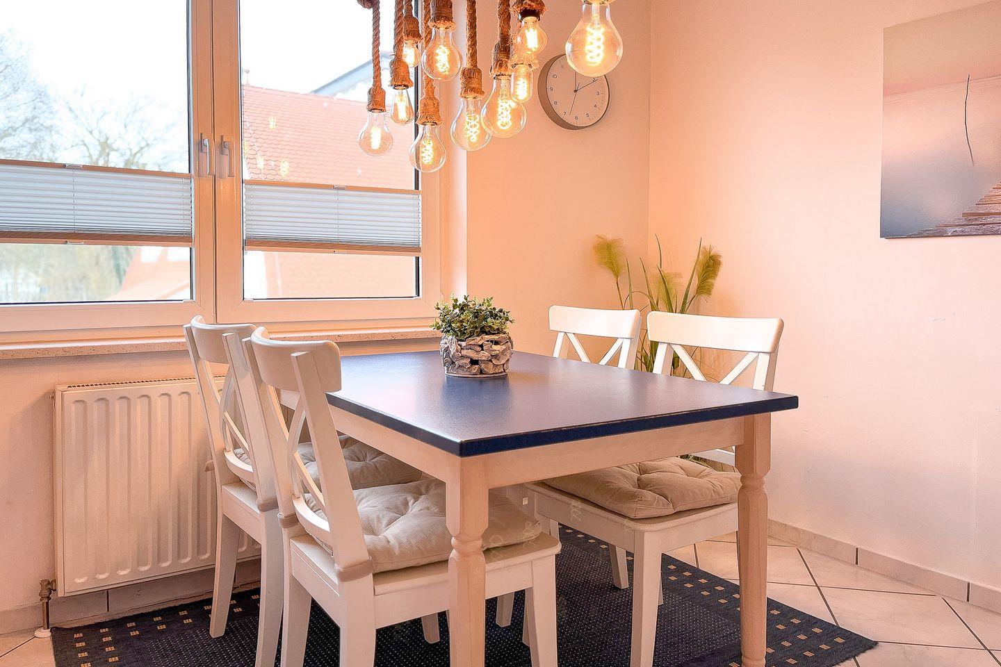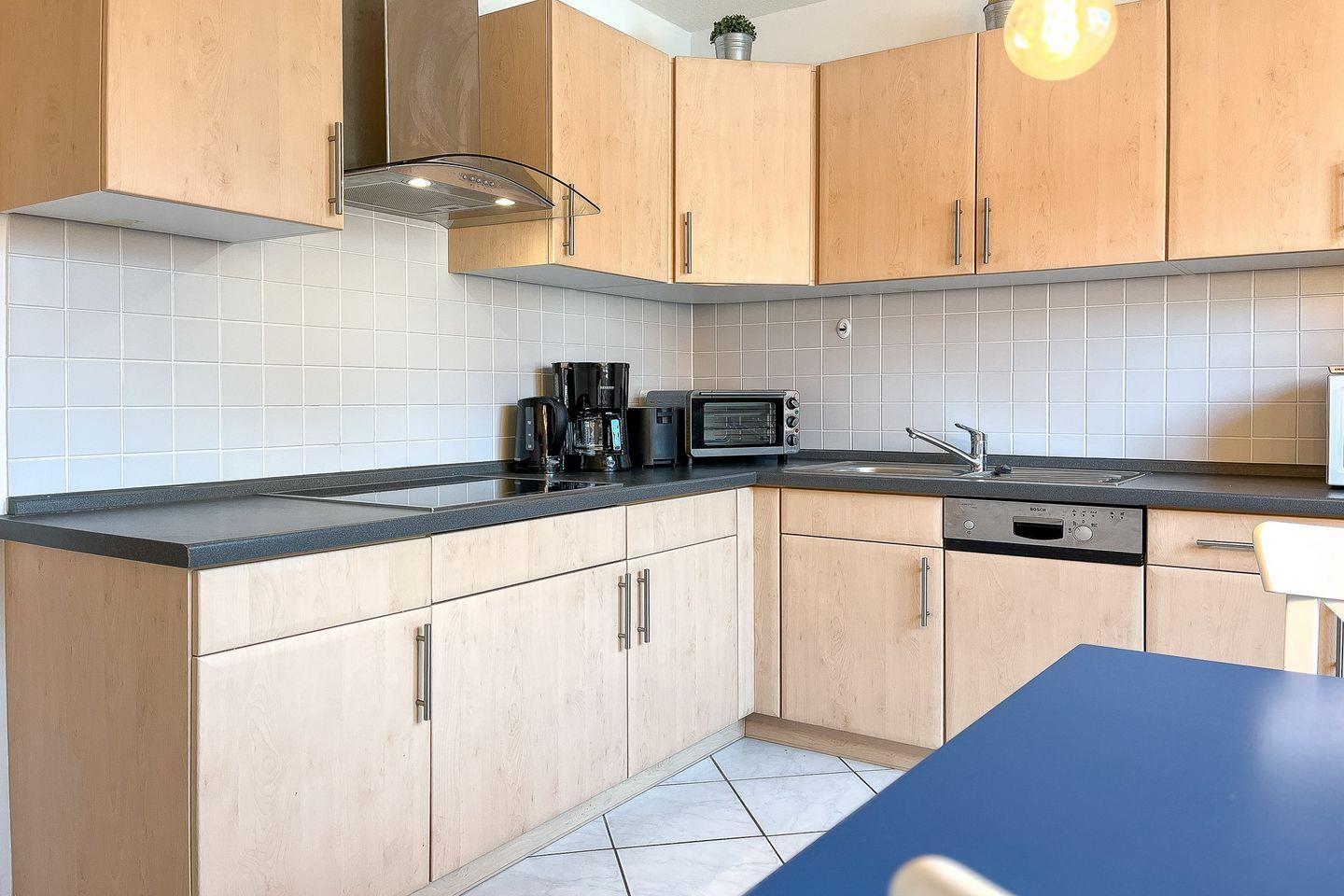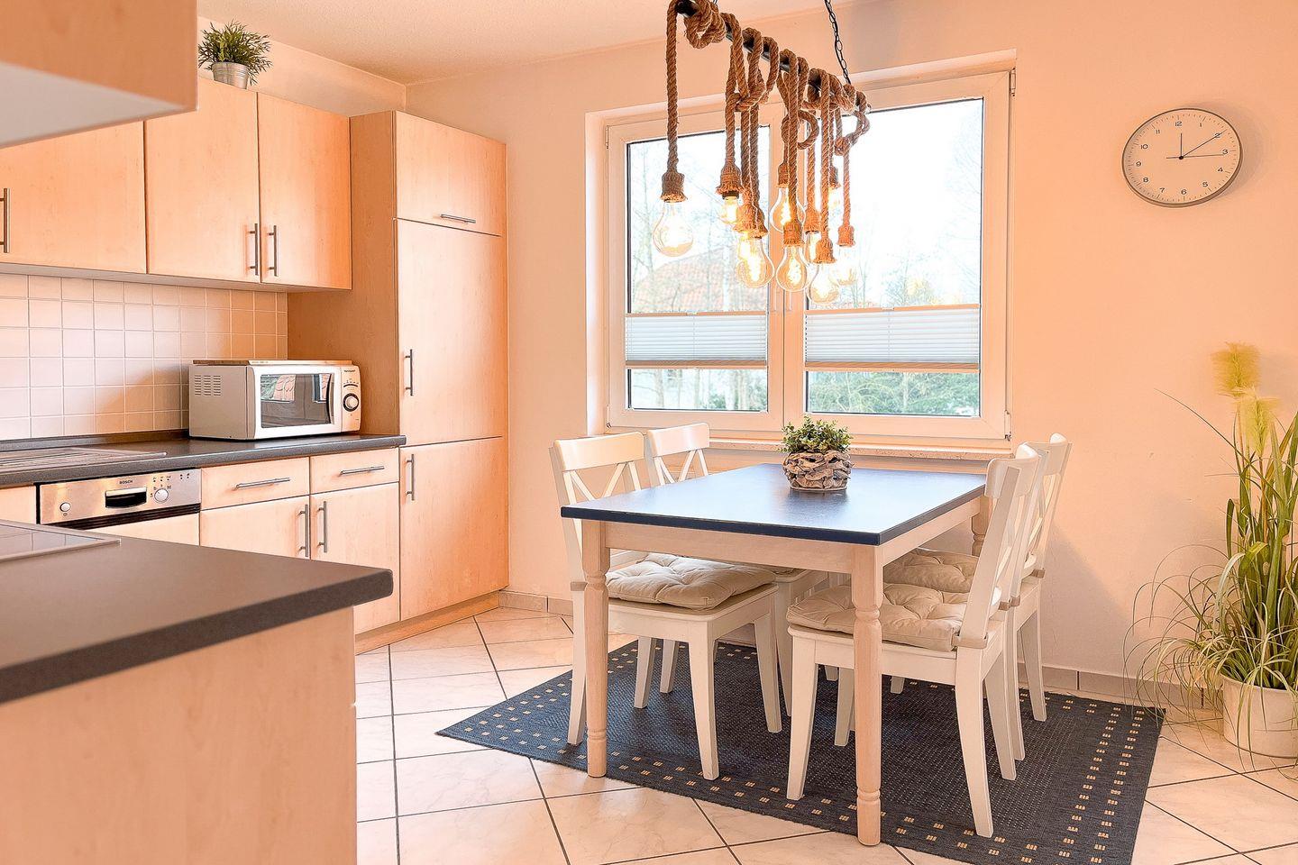 Für die kulinarischen Urlaubsgenüsse steht dir eine moderne, separate Winkelküche mit einem Essplatz für bis zu 4 Personen zur Verfügung. Das gemeinsame Frühstück oder auch das ausgedehnte Abendessen wird zum Erlebnis. Die geflieste Küche der Ferienwohnung ist mit einer Spülmaschine, einem Ceranfeld, einem Kühlschrank mit Gefrierfach und einer Mikrowelle ausgestattet.