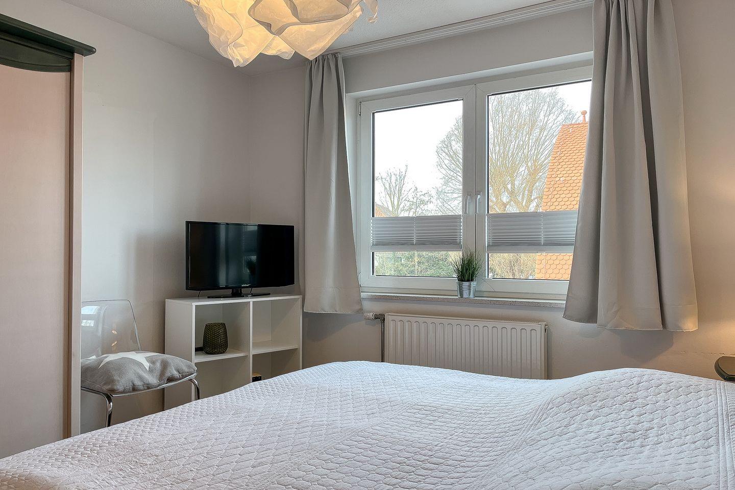 Vom Flur aus gelangst du in das Schlafzimmer, welches mit einem großen Doppelbett (2 x 90 x 200 cm), einem TV, einem Kleiderschrank und zwei Sitzgelegenheiten ausgestattet ist. Der Boden ist mit Laminat ausgelegt. Mit Vorhängen kann der Raum abgedunkelt werden.