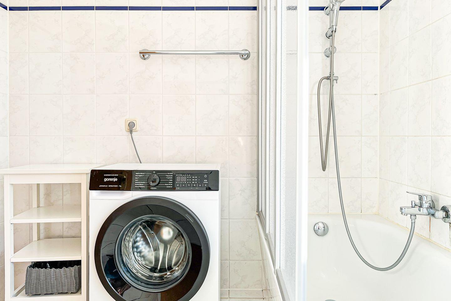 Das geflieste Tageslichtbad komplettiert die Wohnung. Hier findest du eine Badewanne mit variabler Duschabtrennung vor, die sowohl ein ausgiebiges Bad an kühlen Abenden als auch eine erfrischende Dusche nach einem langen Strandtag möglich macht.