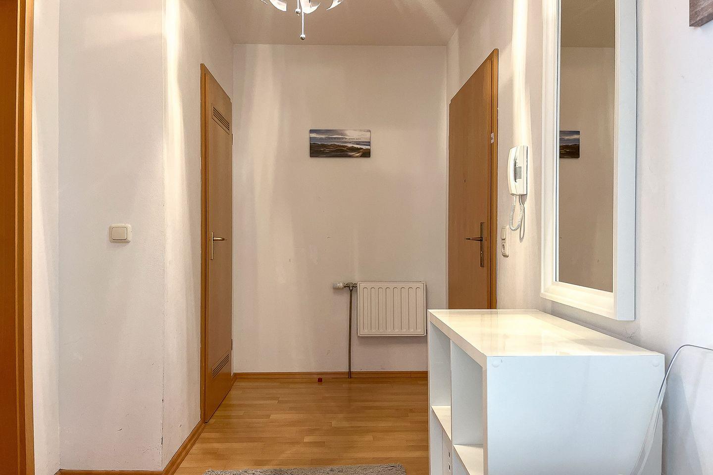 Die Ferienwohnung befindet sich im 1. Obergeschoss und verfügt auf 64 m² über ein Wohnzimmer mit Küchenzeile, ein Schlafzimmer, ein Duschbad und einen nach Westen ausgerichteten Balkon. Die Entfernung zum Strand beträgt 100 Meter.