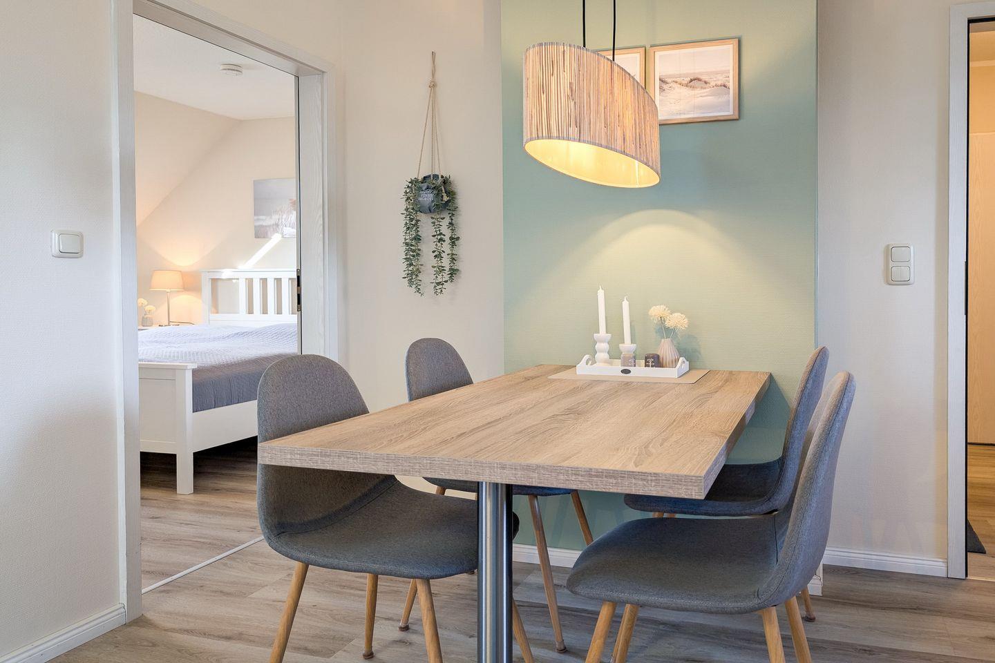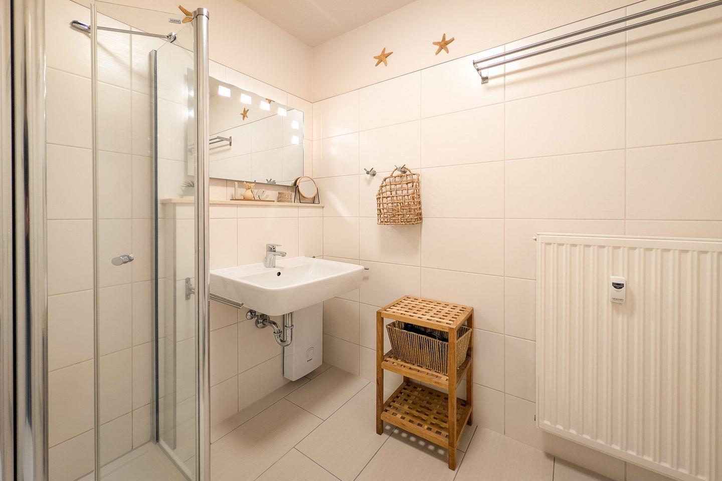 Die Küchenzeile ist voll ausgestattet mit Kühlschrank, einem 4-Platten-Cerankochfeld, Minibackofen und Geschirrspüler. Angrenzend an die Küchenzeile befindet sich ein ansprechender Essplatz – hier kannst du entspannt dinieren. Selbstverständlich ist das funktionale, geflieste Duschbad.
