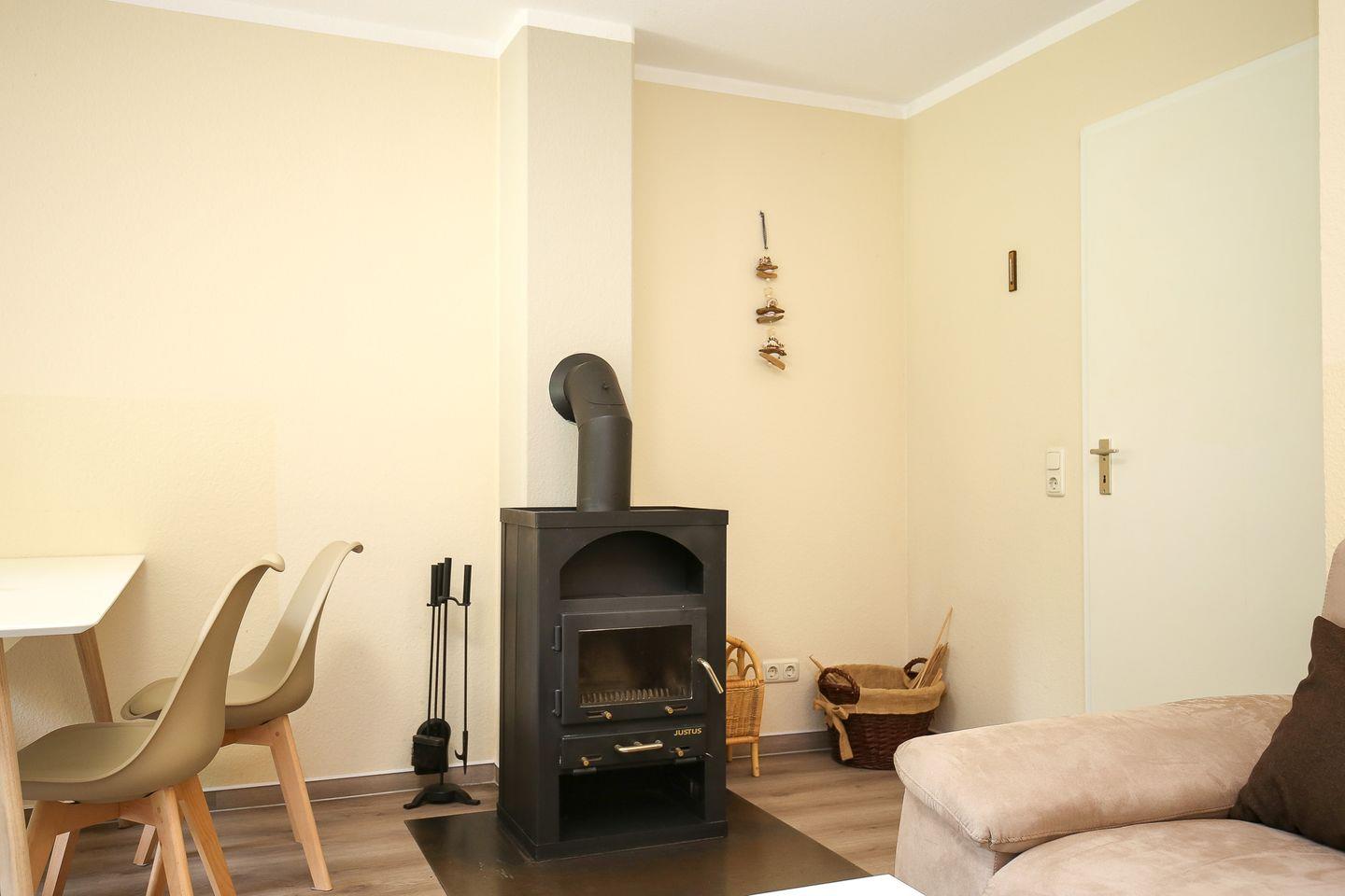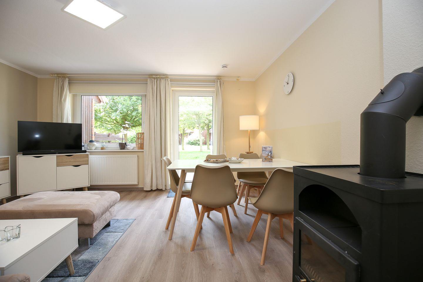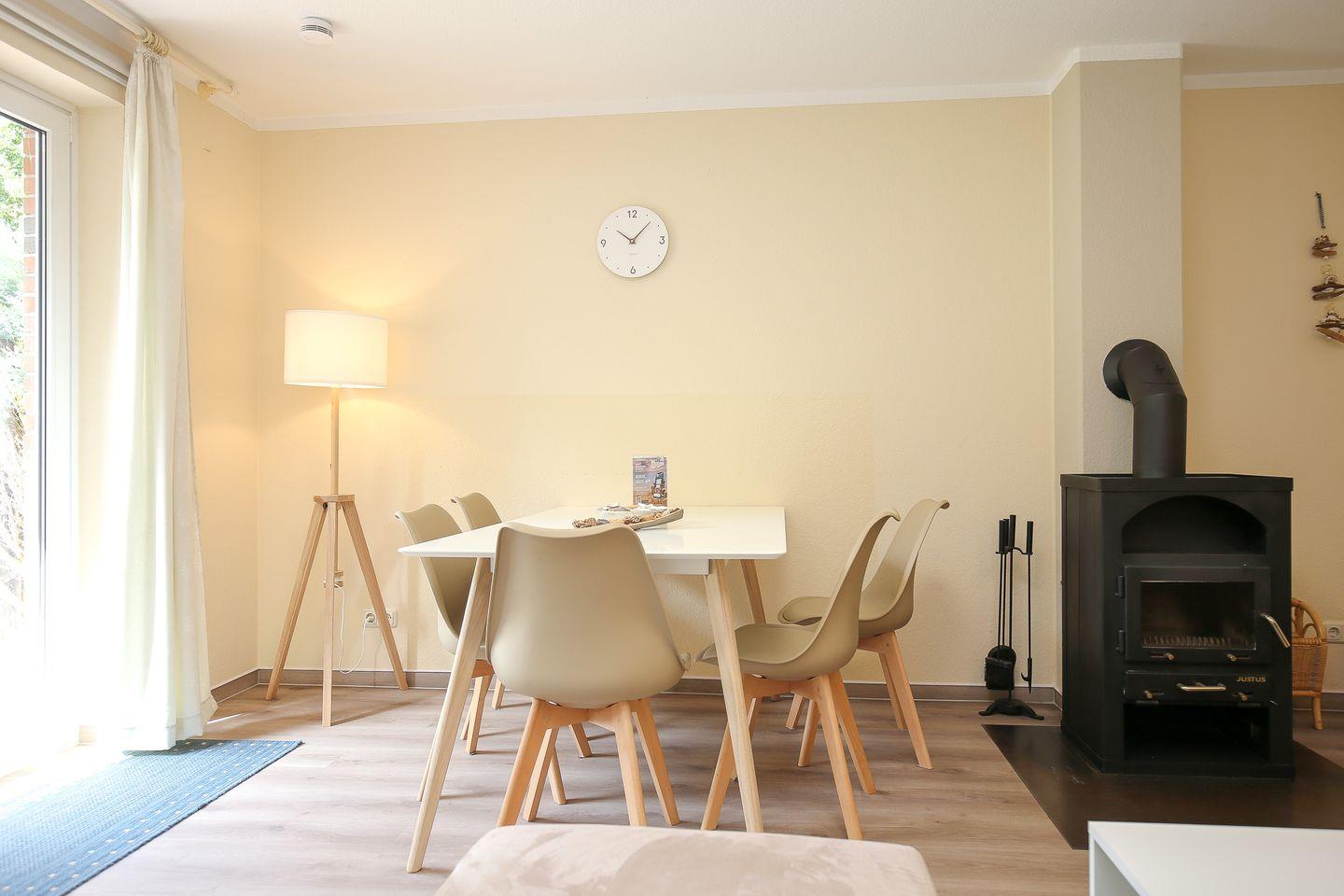 Im Erdgeschoss des Reihenmittelhauses befinden sich eine separate Küche, ein Duschbad sowie ein kombiniertes Wohn-/ Esszimmer mit gemütlicher Couch, Kamin und zusätzlicher Essecke. Zur Unterhaltung stehen hier ein Flatscreen-TV, ein DVD-Player, eine Musikanlage, zahlreiche Bücher und Spiele zur Verfügung. Der in den Wohnbereich integrierte Kamin vermittelt ein behagliches Raumgefühl. Vom Wohnzimmer aus hast du einen direkten Zugang zur Terrasse, die viel Platz zum Spielen und Entspannen bietet.