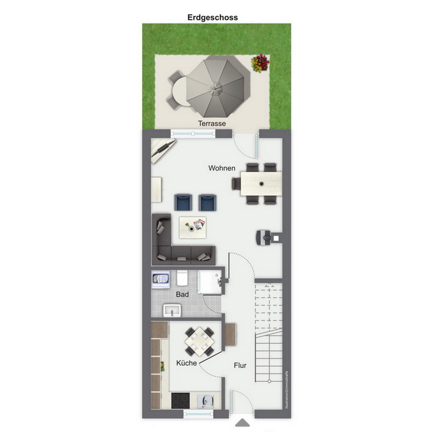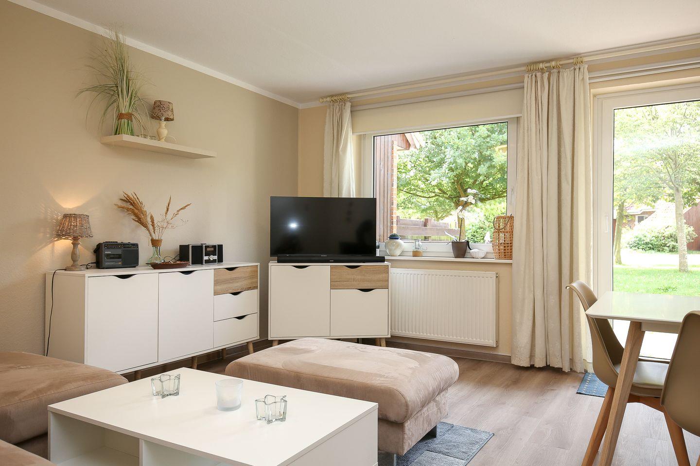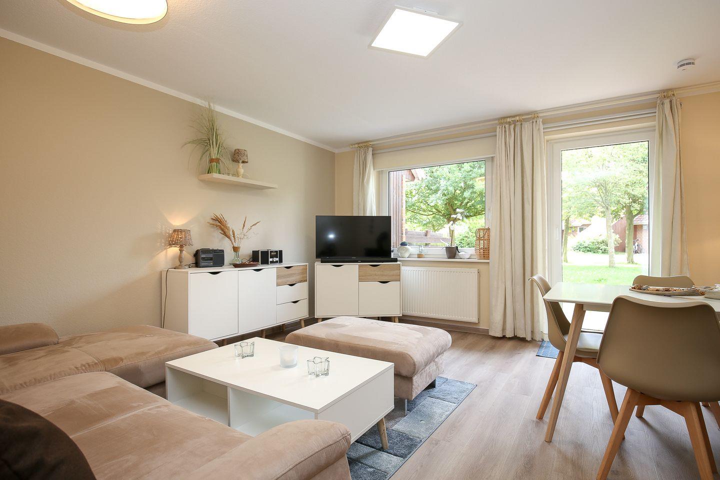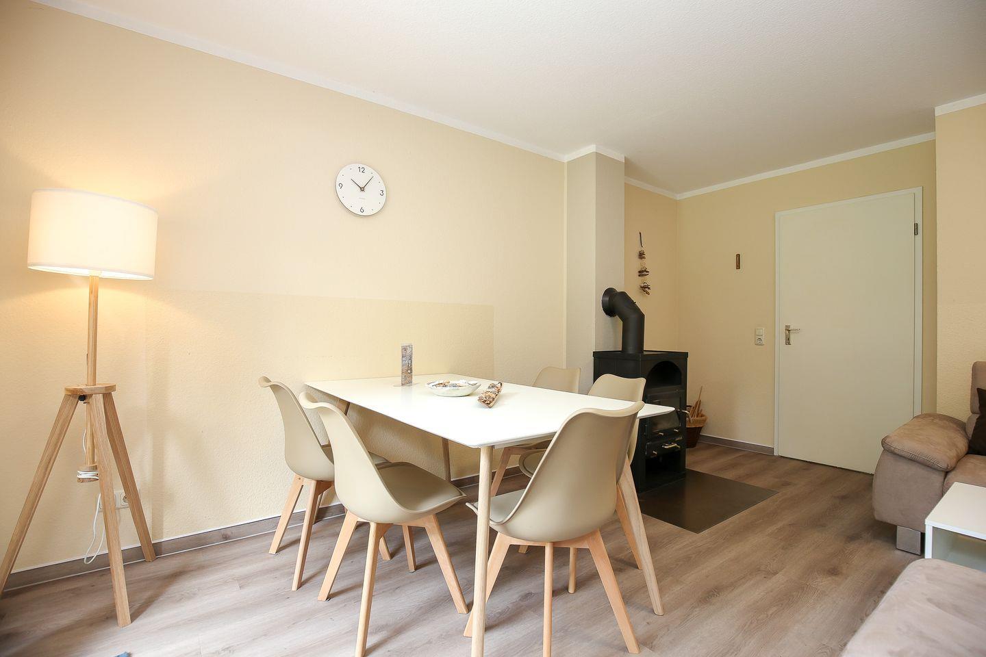 Im Erdgeschoss des Reihenmittelhauses befinden sich eine separate Küche, ein Duschbad sowie ein kombiniertes Wohn-/ Esszimmer mit gemütlicher Couch, Kamin und zusätzlicher Essecke. Zur Unterhaltung stehen hier ein Flatscreen-TV, ein DVD-Player, eine Musikanlage, zahlreiche Bücher und Spiele zur Verfügung. Der in den Wohnbereich integrierte Kamin vermittelt ein behagliches Raumgefühl. Vom Wohnzimmer aus hast du einen direkten Zugang zur Terrasse, die viel Platz zum Spielen und Entspannen bietet.