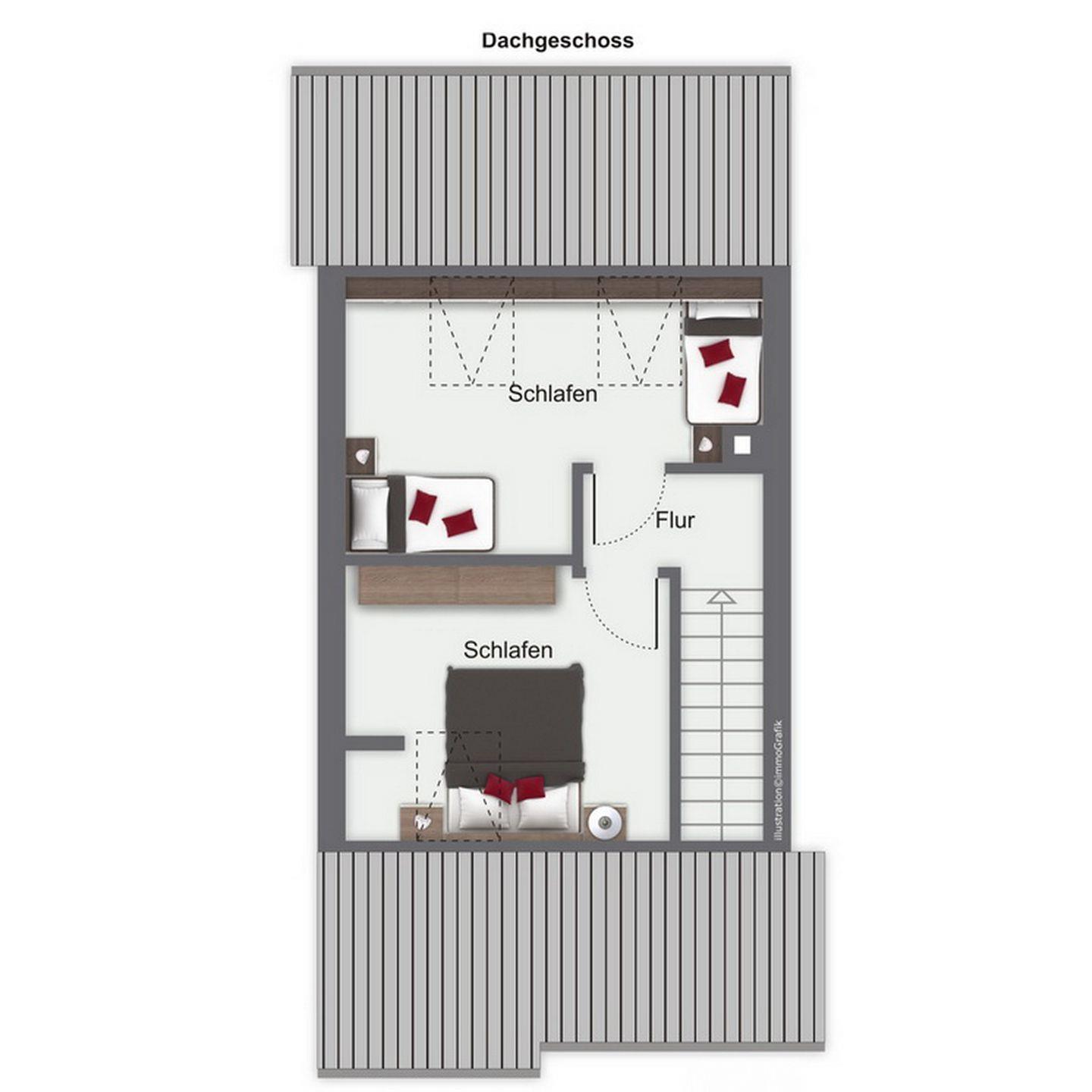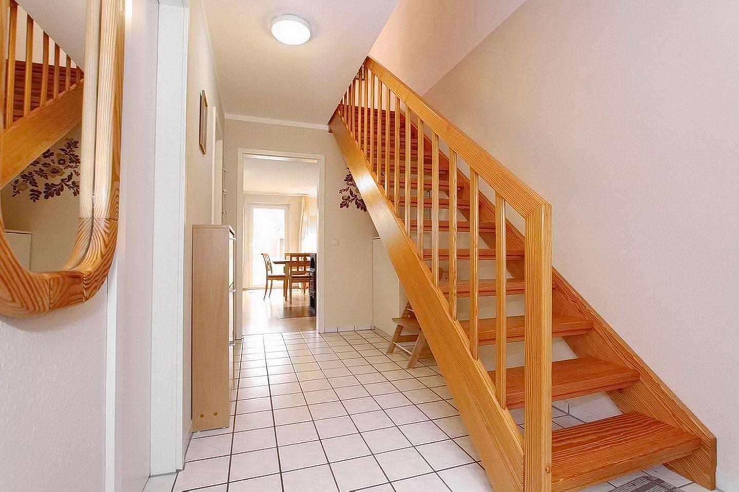 Über die Treppe im Flur gelangst du ins Obergeschoss des Ferienhauses zu den beiden Schlafzimmern. Ein Schlafzimmer ist mit einem Doppelbett
