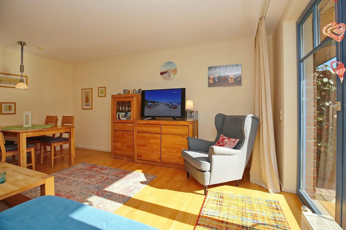 Die begrünte Terrasse mit Mobiliar ist vom Wohnraum zu erreichen. Der Wohn- und Essbereich schafft mit einer gemütlichen Schlafcouch (145 x 220 cm) und einem Essplatz für vier Personen eine wohnliche Atmosphäre. Für Kurzweil sorgen ein Flachbild-TV und eine Stereoanlage.