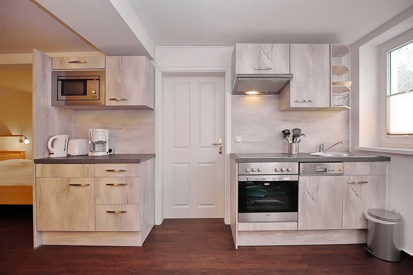 Die integrierte Küchenzeile deiner Ferienwohnung verfügt über Kaffeemaschine, Wasserkocher, Toaster, Mikrowelle, Geschirrspüler Cerankochfeld, Backofen und Kühlschrank. Ein modernes gefliestes Duschbad ist vorhanden. Die gesamte Ferienwohnung ist mit Designbelag ausgelegt.