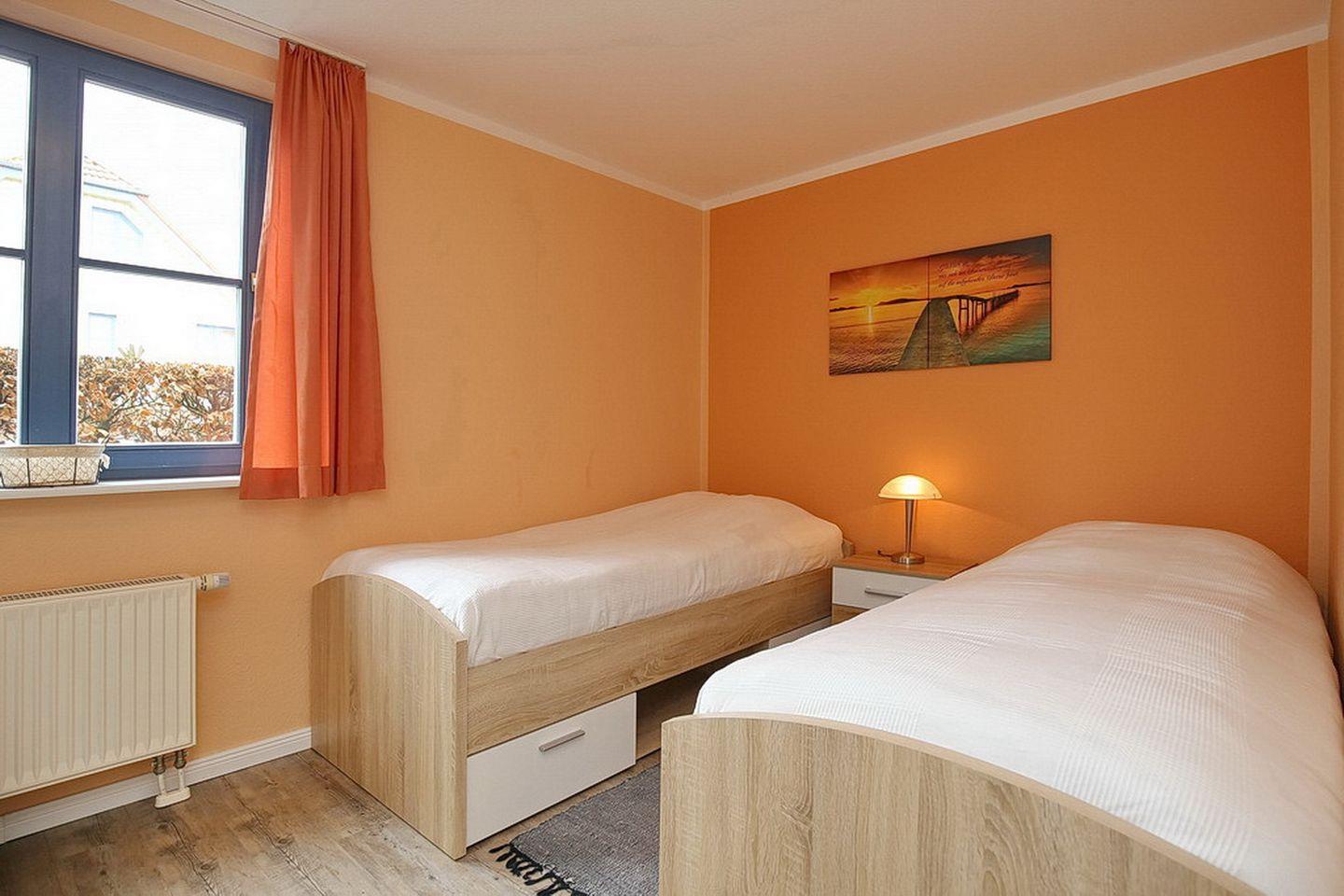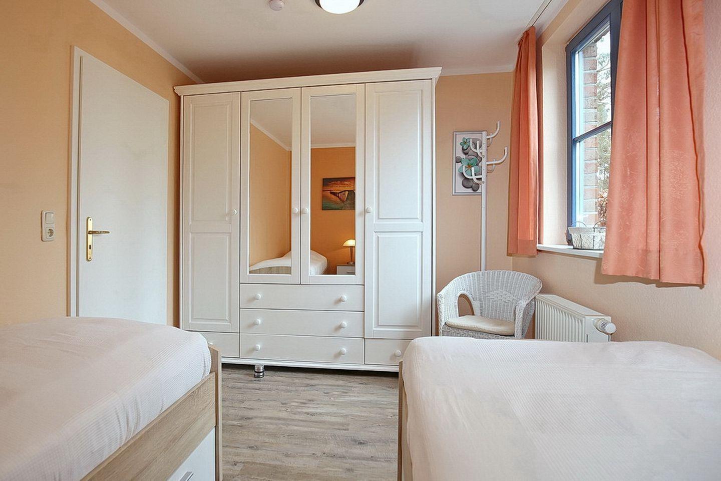 Das Schlafzimmer schafft mit zwei Einzelbetten (90 x 200 cm) (links H3 rechts H2 inkl. Topper) und einem hellen Kleiderschrank ein freundliches Ambiente. An den Fenstern sind Vorhänge zur Verdunklung angebracht.