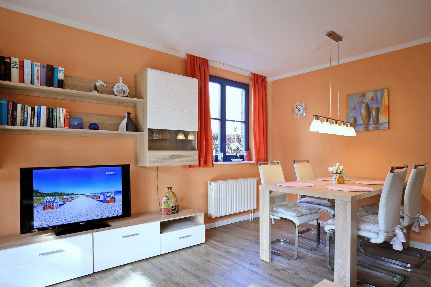 Die möblierte Terrasse mit einer Insektenschutzpendeltür erreichst du vom Wohnbereich aus. Das moderne Wohnzimmer ist mit einem Sofa mit Schlaffunktion (160 x 190 cm) und einem Esstisch für 4 Personen gestaltet. Zum Zeitvertreib dienen ein Flachbild-TV, eine Stereoanlage und eine Auswahl an Büchern und Spielen.