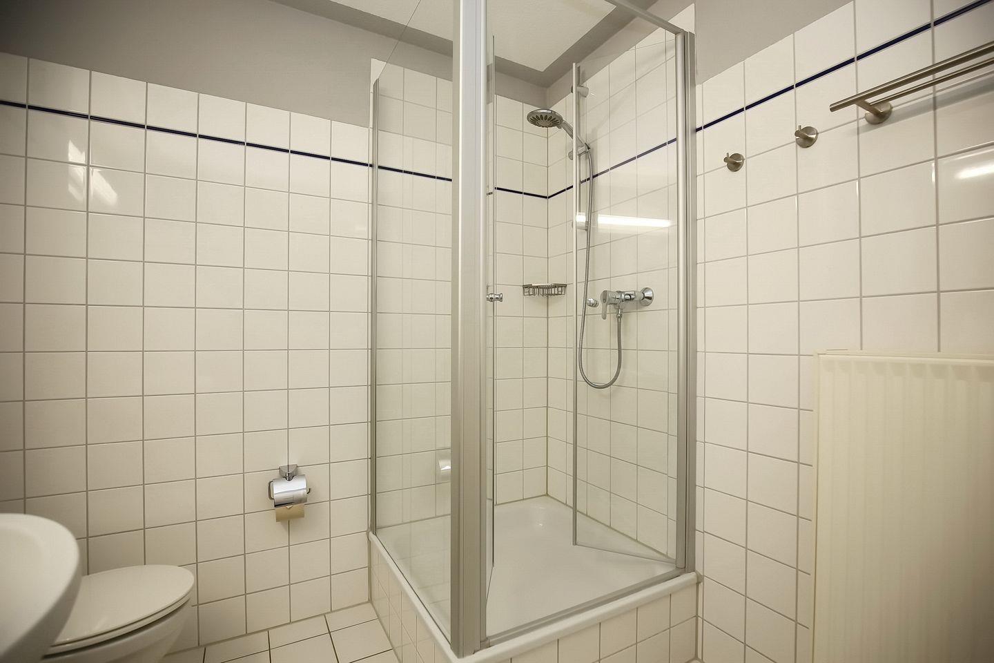 Auch ein gefliestes Duschbad mit moderner Dusche ist vorhanden. Der Bodenbelag in der gesamten Wohnung ist Vinyl. Im Keller dieser Ferienwohnung stehen zwei Fahrräder als Zusatzausstattung (ohne Gewähr und Rechtsanspruch) zur Verfügung.