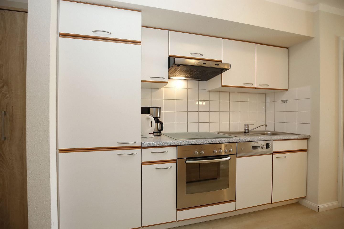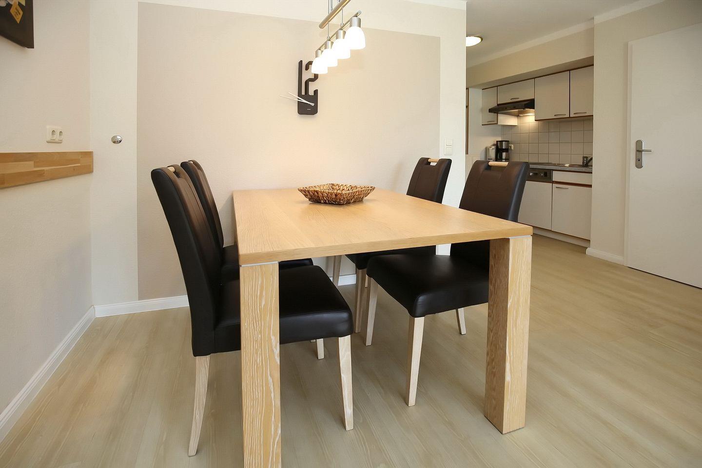 Die voll ausgestattete Küchenzeile ist mit Geschirrspüler, Cerankochfeld, Backofen, Mikrowelle und Kühlschrank mit Gefrierfach eingerichtet. Die Mahlzeiten können am Esstisch im Wohnbereich eingenommen werden. Ein Kinderhochstuhl steht zur Verfügung.