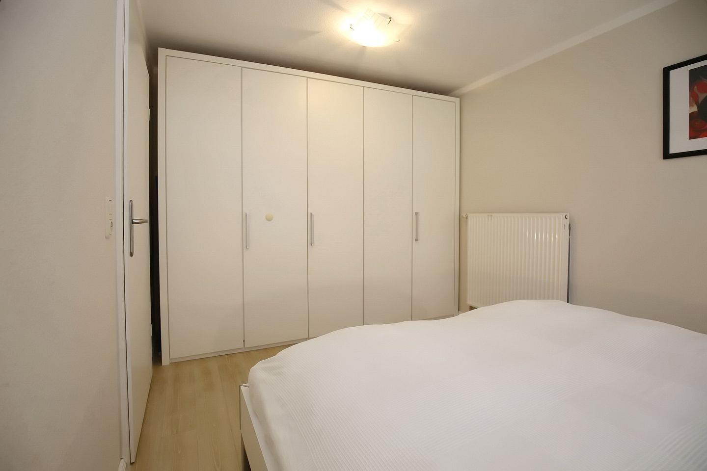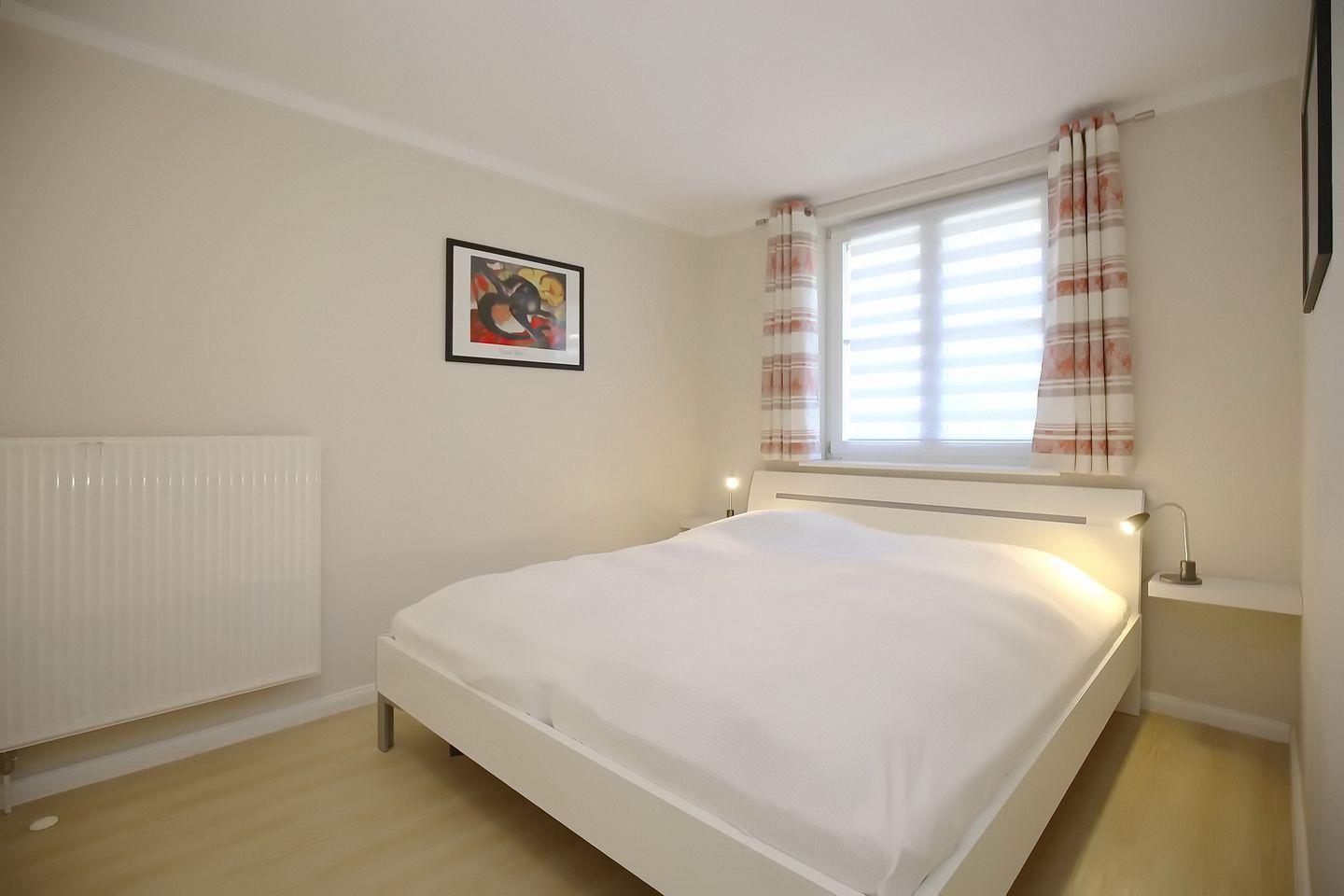 Das Schlafzimmer ist mit einem Doppelbett (180 x 200 cm) und einem großen Kleiderschrank eingerichtet. Hier befindet sich auch ein Reisebett für die kleinen Gäste. Zur Verdunklung gibt es eine Jalousie am Fenster.
