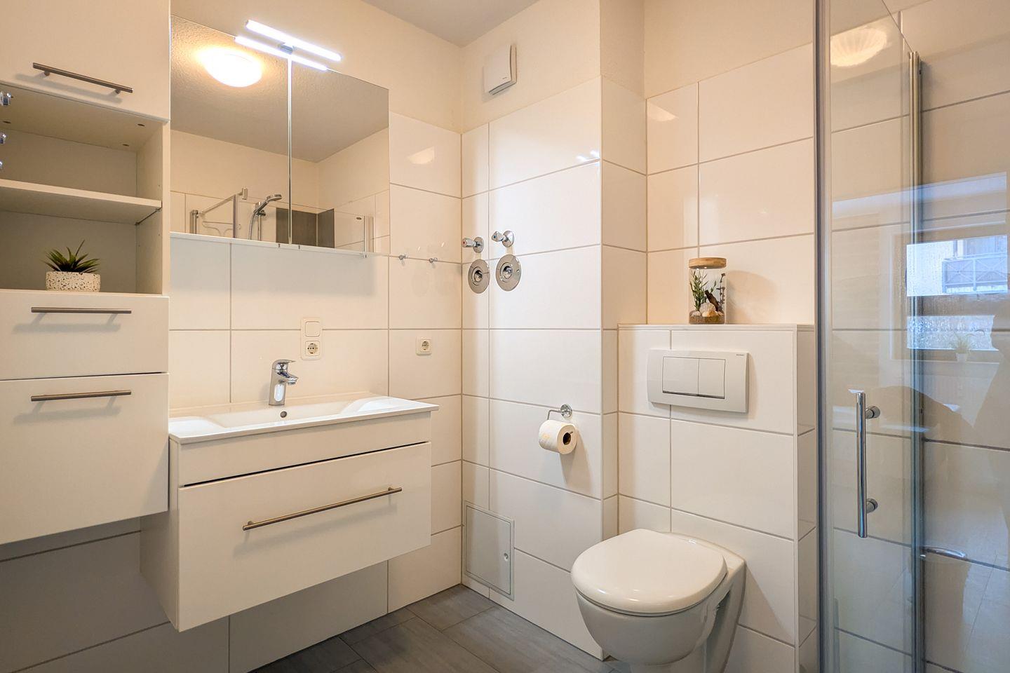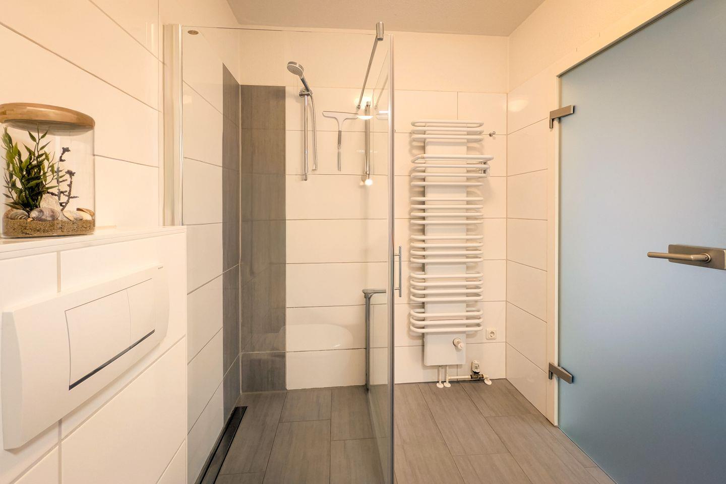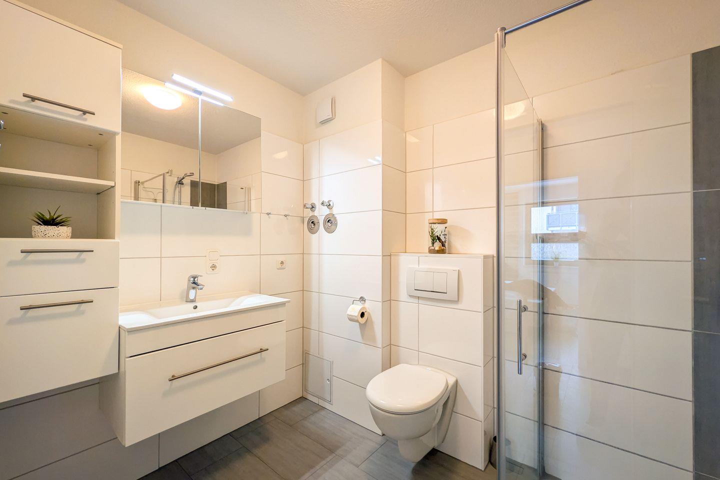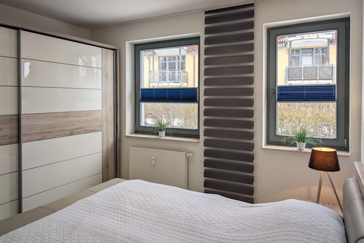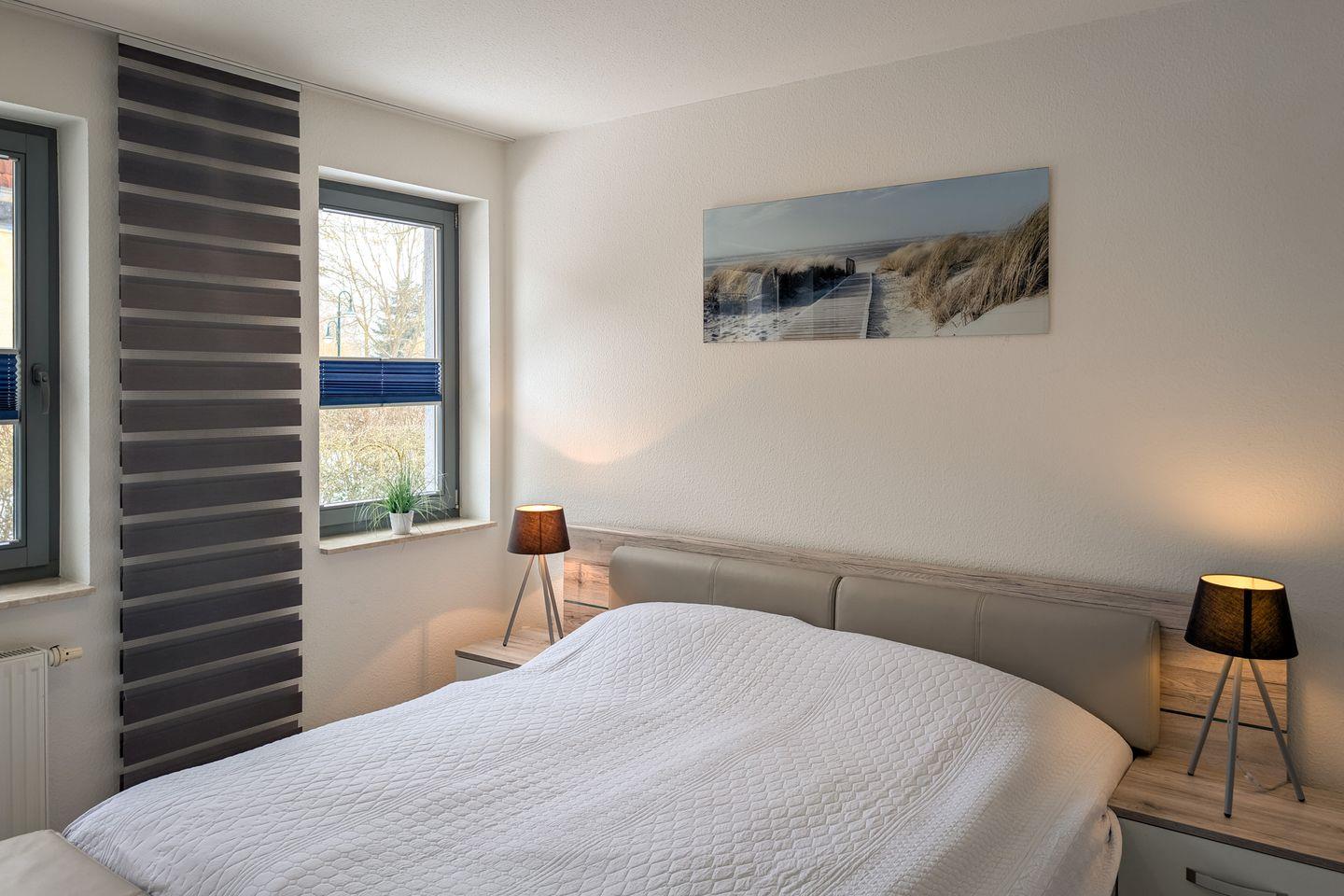 Das Schlafzimmer verfügt über ein Doppelbett mit zwei Matratzen (2 x 90 x 200 cm), einen Kleiderschrank und einen zweiten Fernseher (Smart TV). Auch ein Duschbad mit moderner Eckdusche, Handtuchheizung und Fußbodenheizung ist vorhanden. Die Böden im Wohnzimmer und Bad sind gefliest, das Schlafzimmer ist mit Designbodenbelag ausgelegt. An den Fenstern befinden sich Plissees.