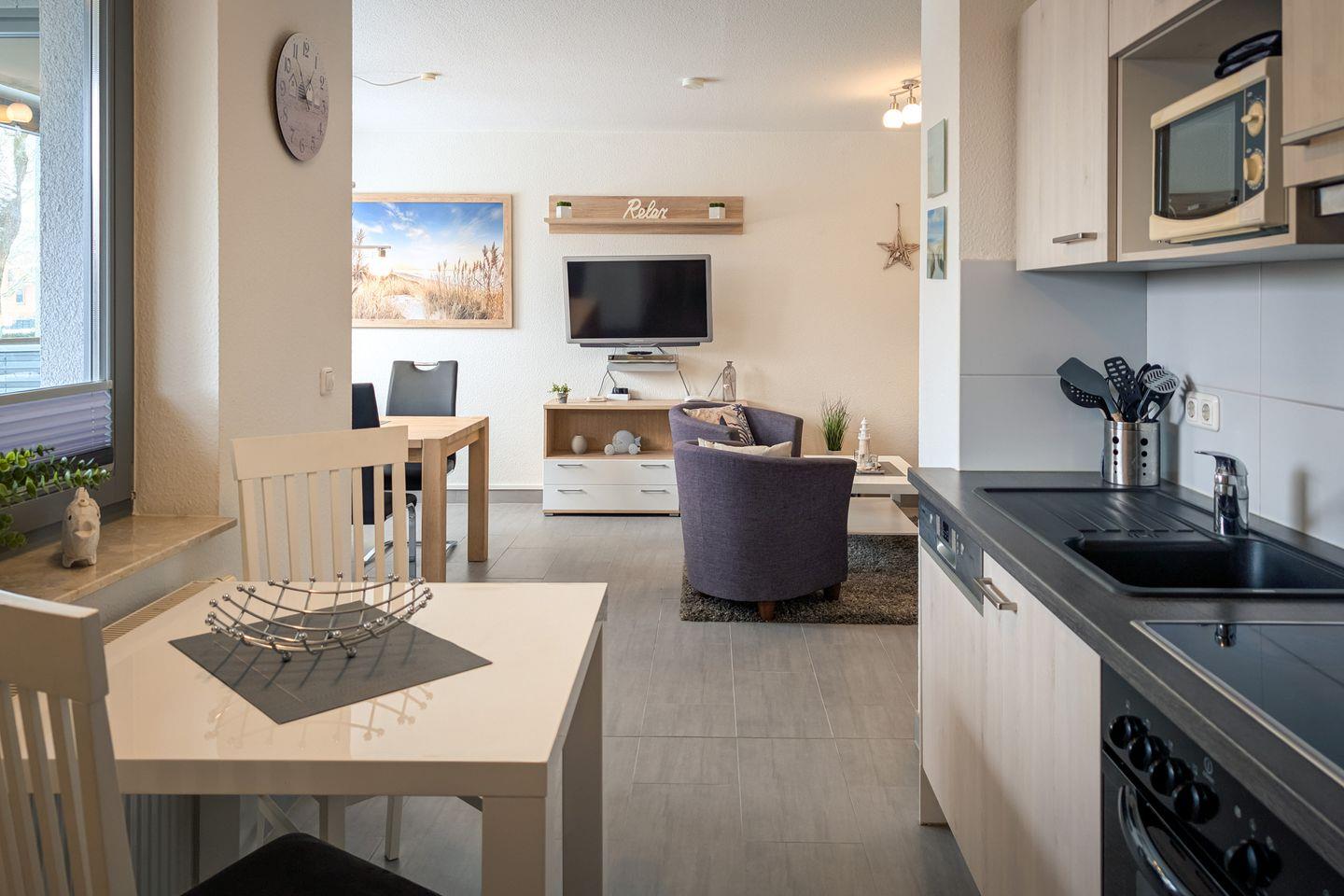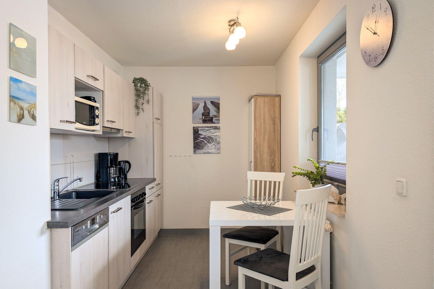 Direkt neben dem Wohnbereich findest du die Küchenzeile mit einem zweiten kleinen Essbereich vor. Die Küchenzeile ist modern und praktisch, u.a. mit Cafissimo-Kapselmaschine, Geschirrspüler, 4-Platten-Cerankochfeld mit Backofen und Kühlschrank mit Tiefkühlfach eingerichtet.