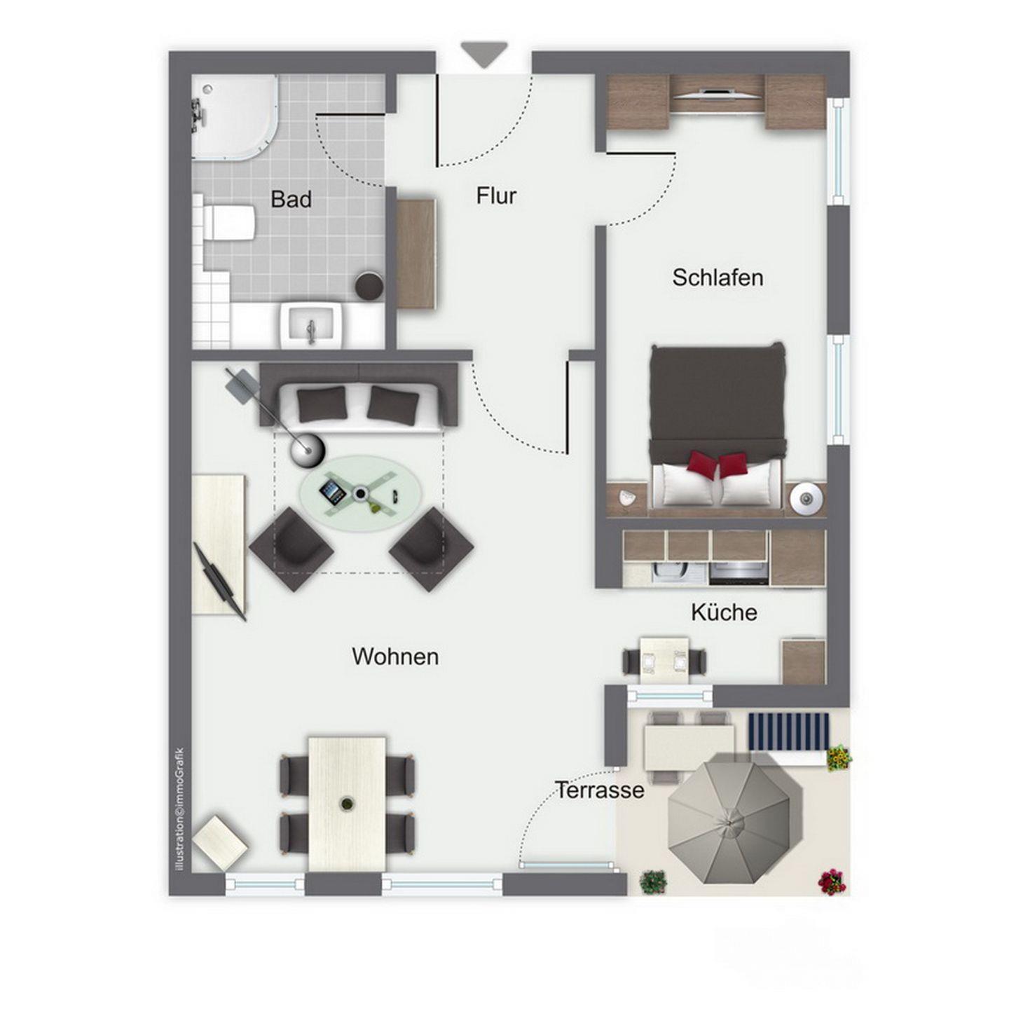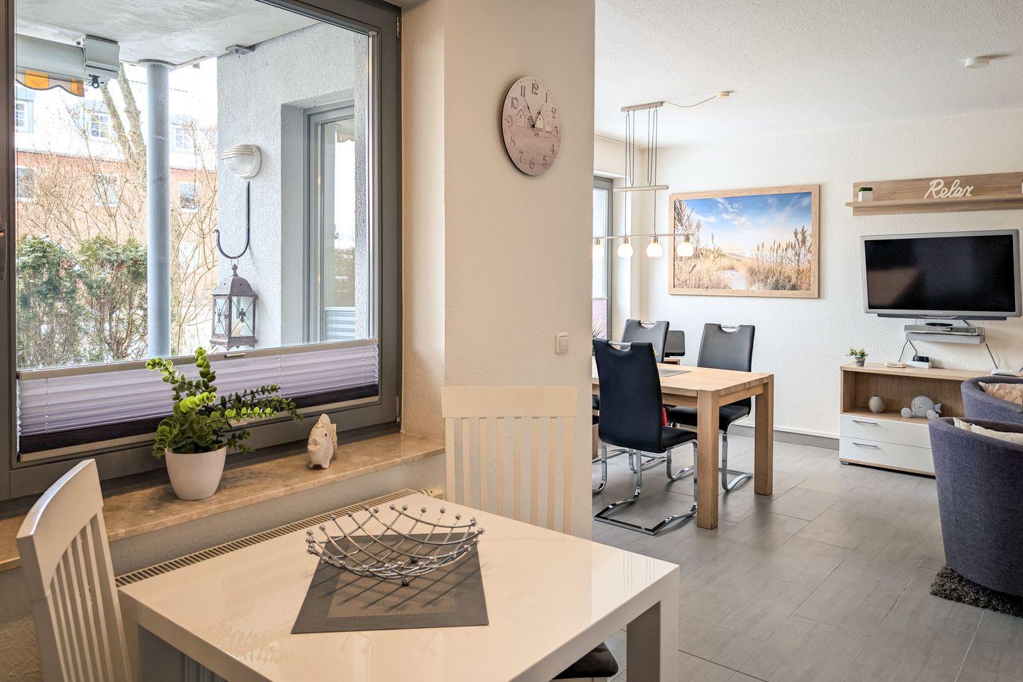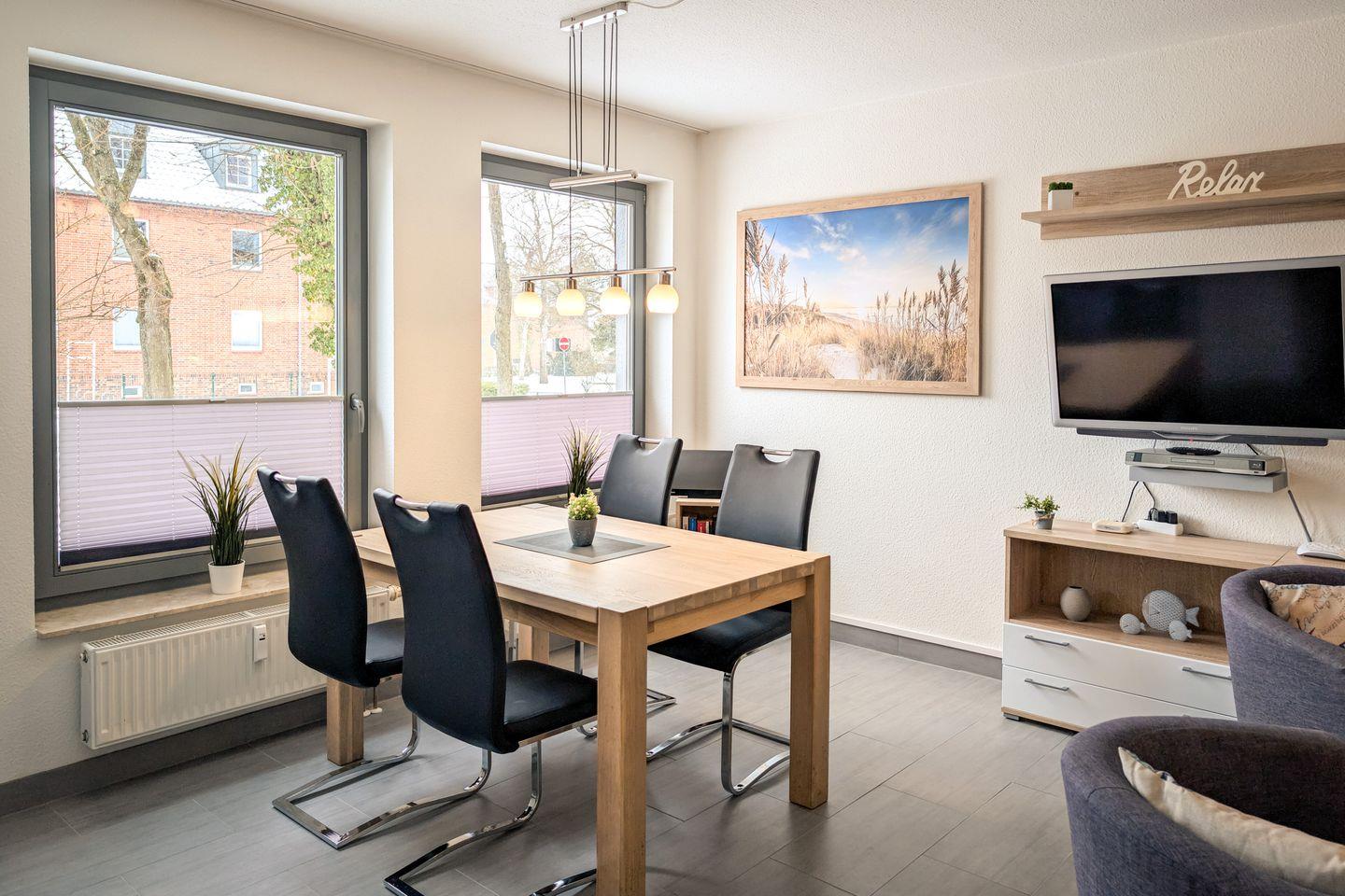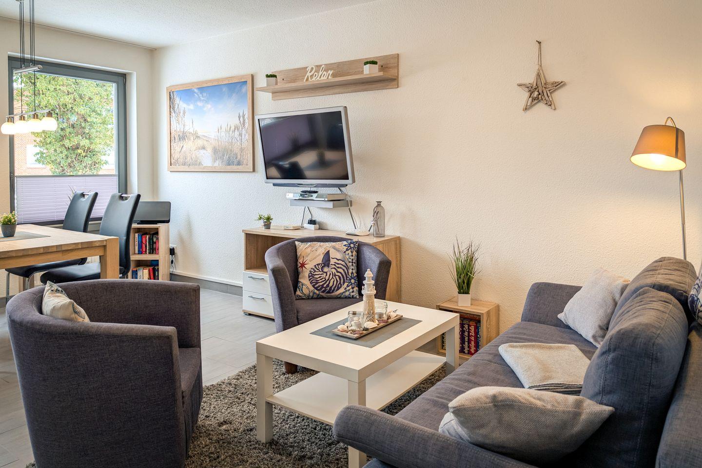 Im modernen Wohnzimmer befinden sich eine Doppelschlafcouch (140 x 200 cm) für 2 Personen, ein Couchtisch, ein Flachbild-TV und der Essbereich für 4 Personen. Direkt vom Wohnzimmer gelangst du auf die Südterrasse, auf der ein Strandkorb und bequeme Terrassenmöbel zum Relaxen einladen. Eine Hecke bietet den nötigen Sichtschutz.
