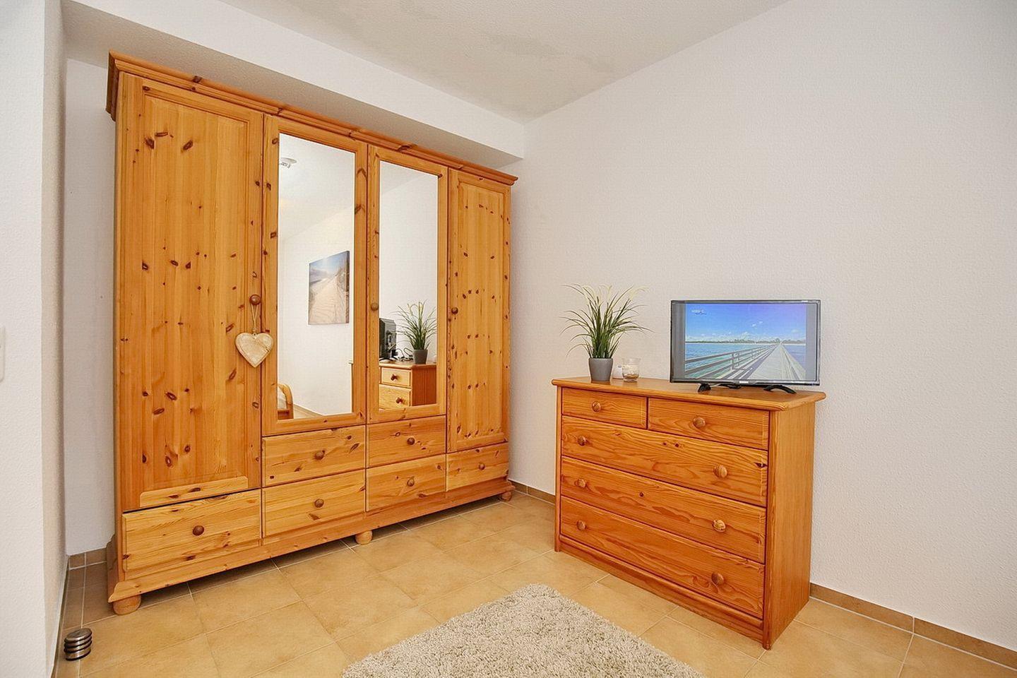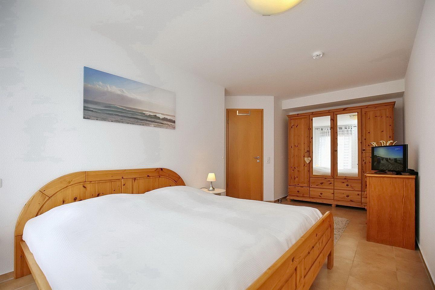 Das Schlafzimmer verfügt über ein Doppelbett (2x90 x 200 cm) und einen Kleiderschrank mit viel Stauraum sowie einem zweiten TV. Außerdem ist im Schlafzimmer genügend Platz, um das zur Wohnung gehörende Kinderreisebett aufzustellen.