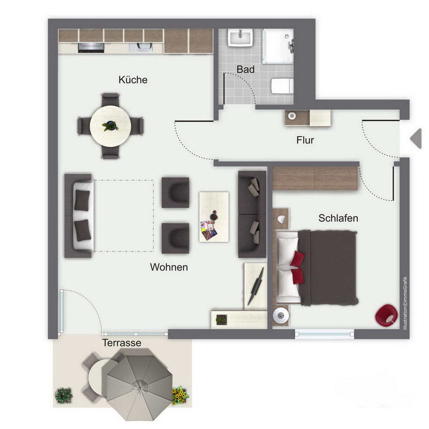 In dieser Erdgeschoss-Ferienwohnung mit einer Größe von ca. 50 m² findest du ein helles Wohnzimmer mit Küchenzeile und Zugang zur Nord-Terrasse, ein Schlafzimmer und ein gefliestes Duschbad. Zum Strand sind es nur ca. 100 Meter.