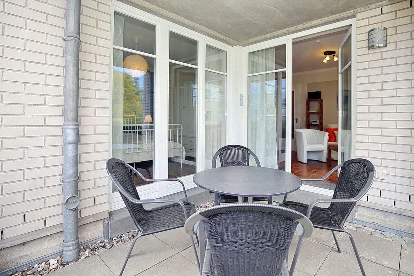Genießen Sie die Ostseeluft auf der Terrasse! Hier stehen Ihnen Tisch und Stühle mit Auflagen zur Verfügung. Im Flur ist ein Einbauschrank mit Staubsauger, Besen u. a. Reinigungsutensilien und einem Wäscheständer. Ein Teil des Schrankes kann für die Garderobe genutzt werden. Das Duschbad mit Duschkabine, Waschbecken und WC macht die Wohnung komplett.