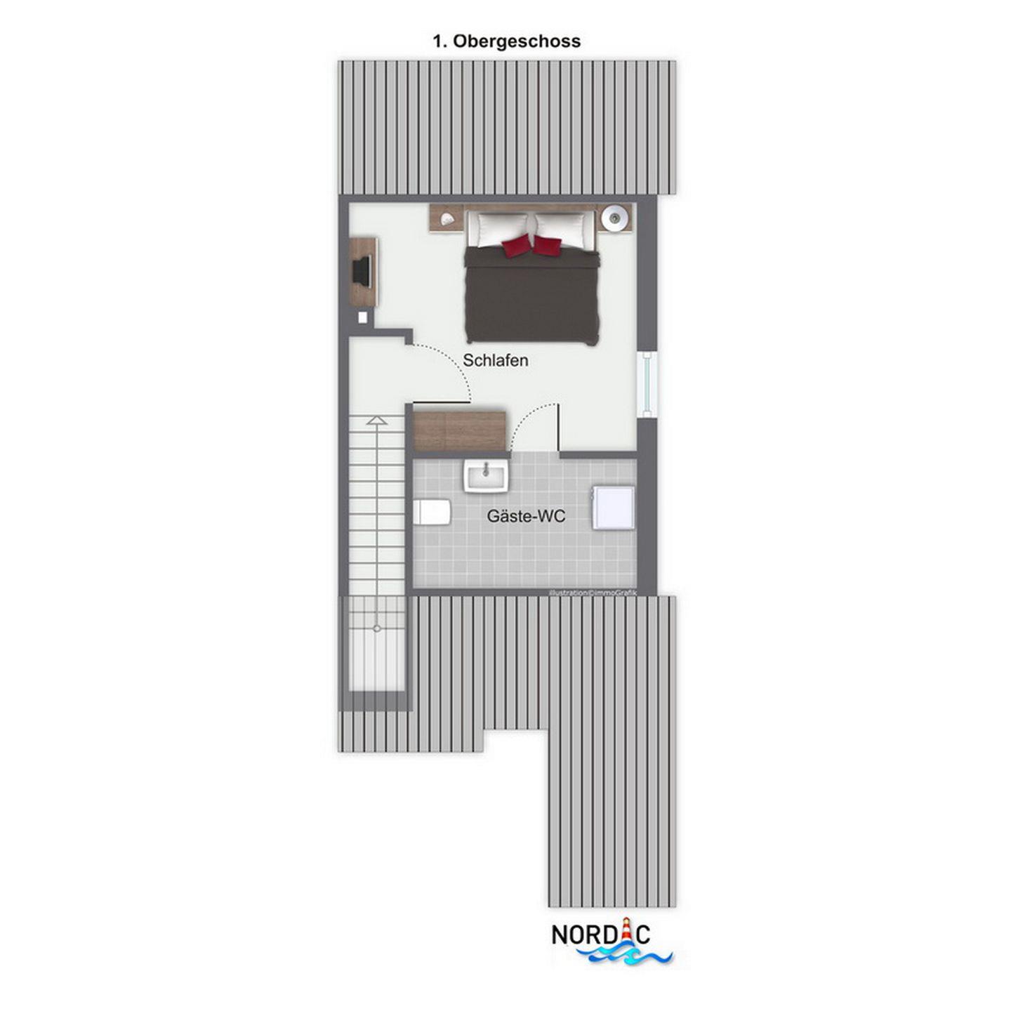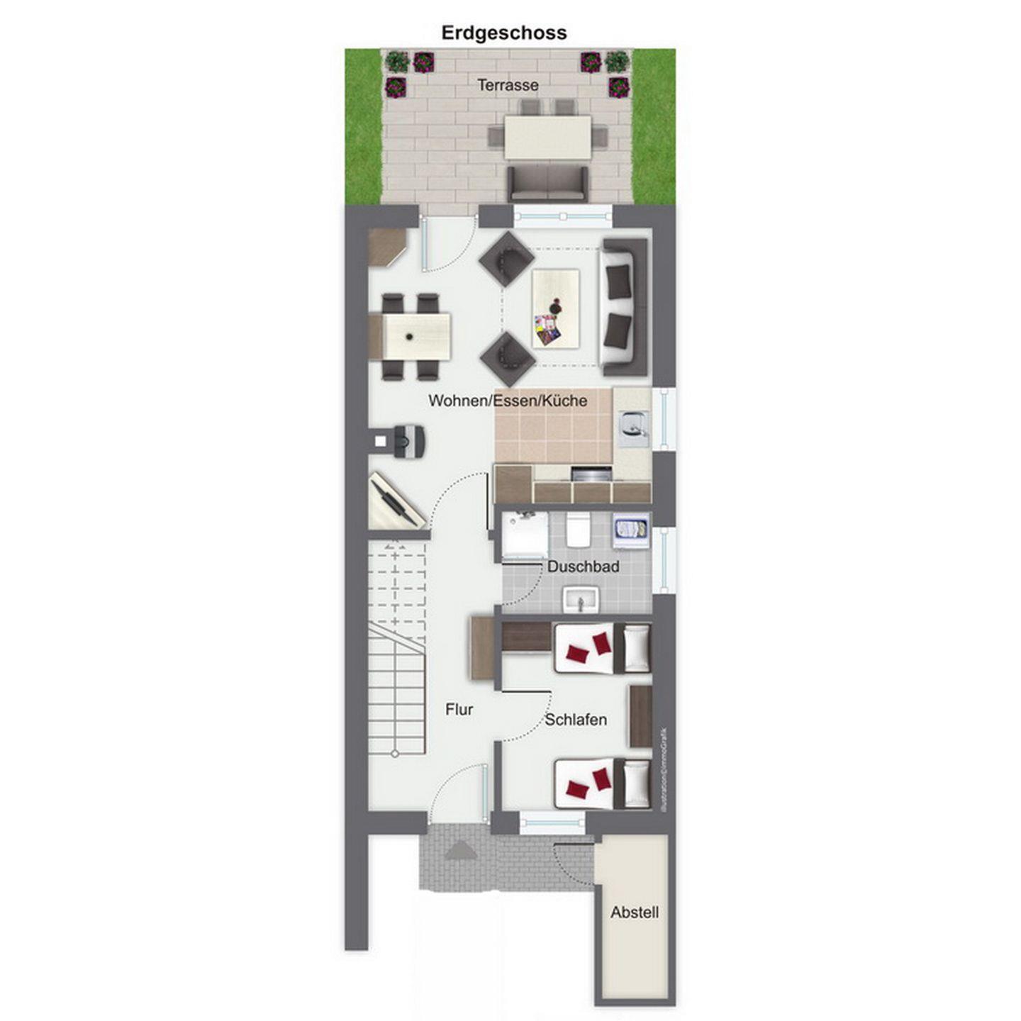 Das Endreihenhaus mit ca. 63 m² verläuft über zwei Etagen und hat eine sonnige Süd-West-Terrasse. Es liegt in schöner Lage am Rande des Urlauberdorfs. Du bewohnst im Erdgeschoss das Wohnzimmer, ein Schlafzimmer und das Duschbad. Im 1. Obergeschoss liegen das zweite Schlafzimmer und ein Gäste-WC. Zum Strand sind es vom Urlauberdorf nur ca. 350 m.