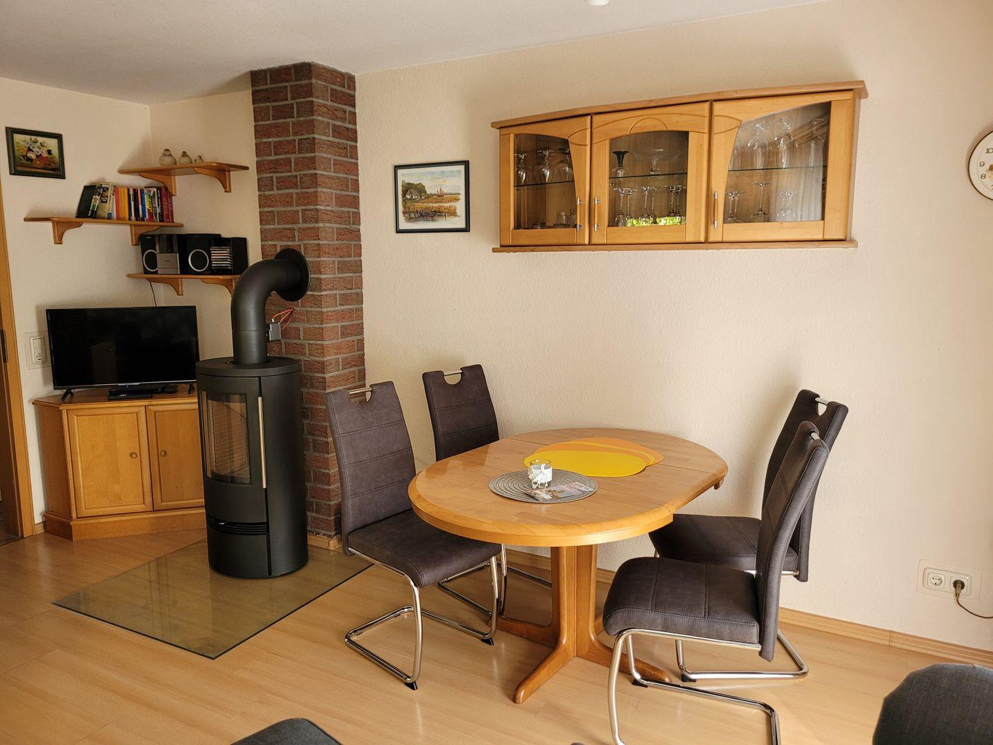 Die voll ausgestattete Küchenzeile bietet mit Geschirrspüler, 4-Platten-Herd, Backofen, Kühlschrank mit Gefrierfach und Mikrowelle allen Komfort. Auch der Essbereich mit Esstisch und Stühlen befindet sich in unmittelbarer Nähe der Küchenzeile.