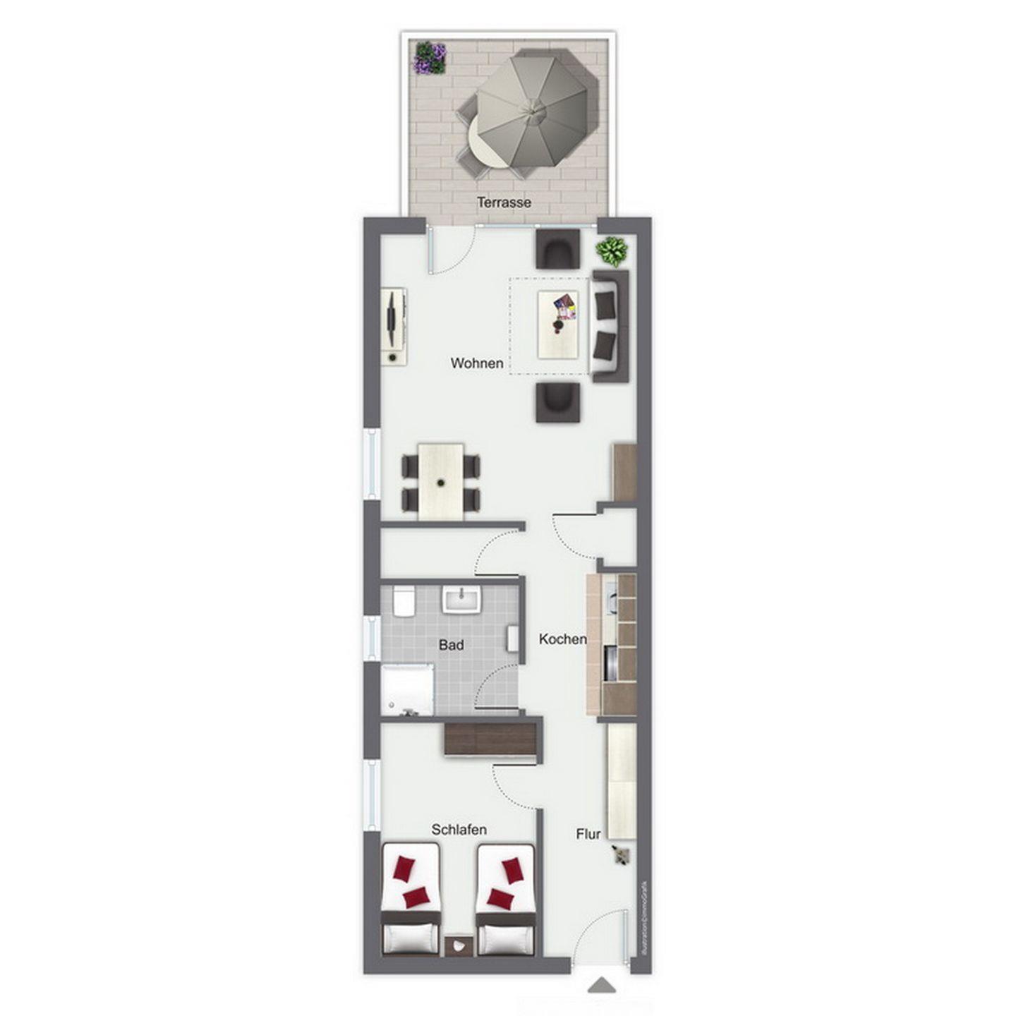 Die sonnige Erdgeschoss-Wohnung mit einer überdachten Terrasse in Süd-West Lage liegt am Ende des Hauses 2. Auf ca. 55 m² bewohnst du einen Wohn- und Essbereich, ein Schlafzimmer, eine Küchenzeile und ein Duschbad. Zum Strand sind es vom Feriendorf Papillon nur ca. 250 m.
