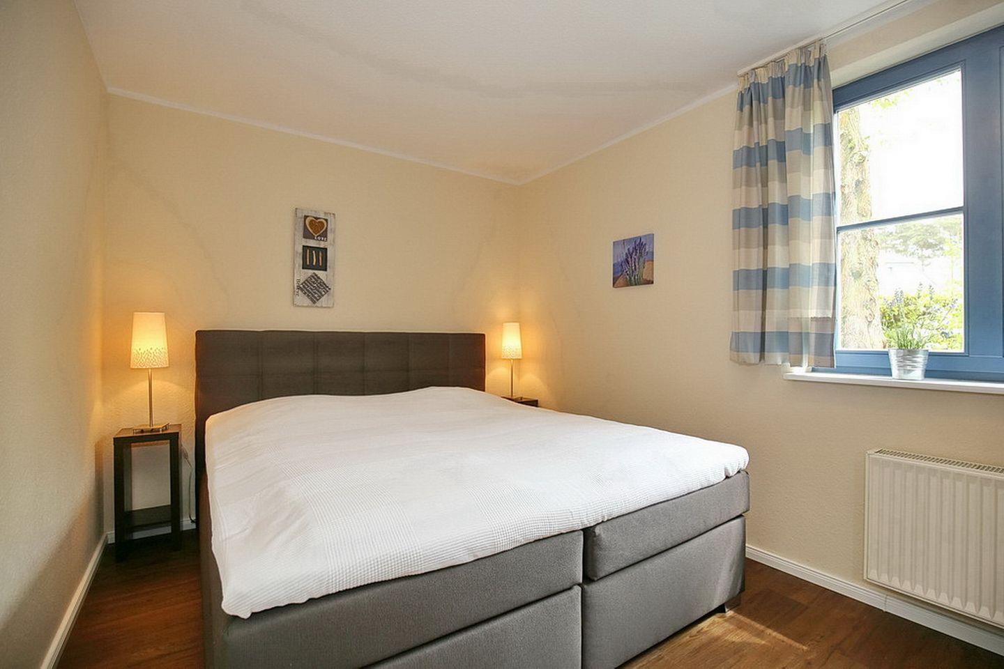 Im Schlafzimmer findest du ein Boxspringbett (180 x 200 cm, durchgehender Topper) und einen geräumigen Kleiderschrank vor. Das Fenster wird mit Vorhängen verdunkelt. Ein zweiter Kleiderschrank auf dem Flur bietet weitere Ablagemöglichkeiten für deine mitgebrachte Garderobe.